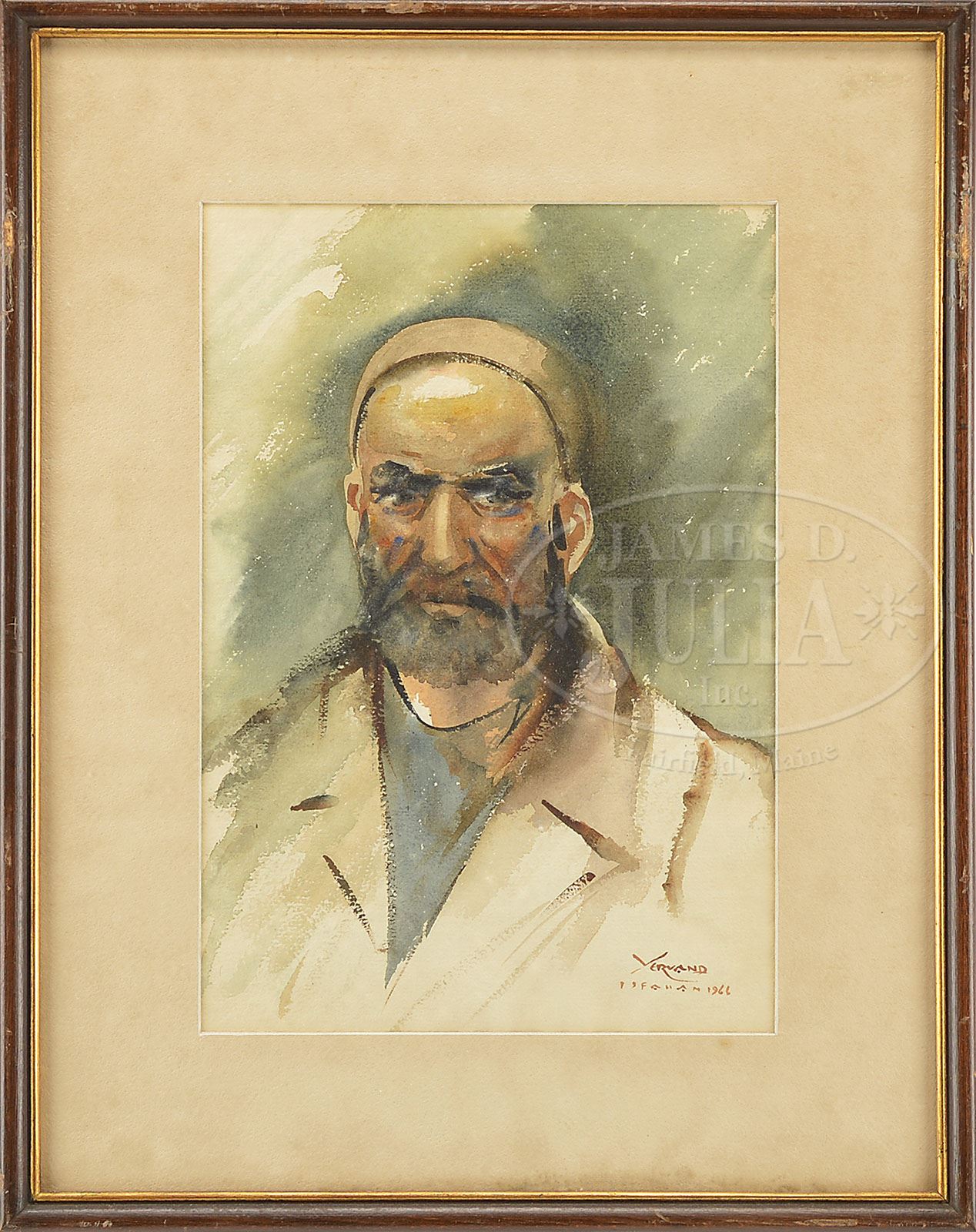 YERNAND (Mid 20th Century) PAIR OF ARAB PORTRAITS OF MEN. Watercolors Housed in identical modern wood frames with mattes with scrapes & losses Signed lower right “Yernand Isfahan 1966″ SIZE: Sight: 13-3/4″ x 9-1/2”. Overall: 21-1/2″ x 17″ CONDITION: Good 9-91792 (300-500)