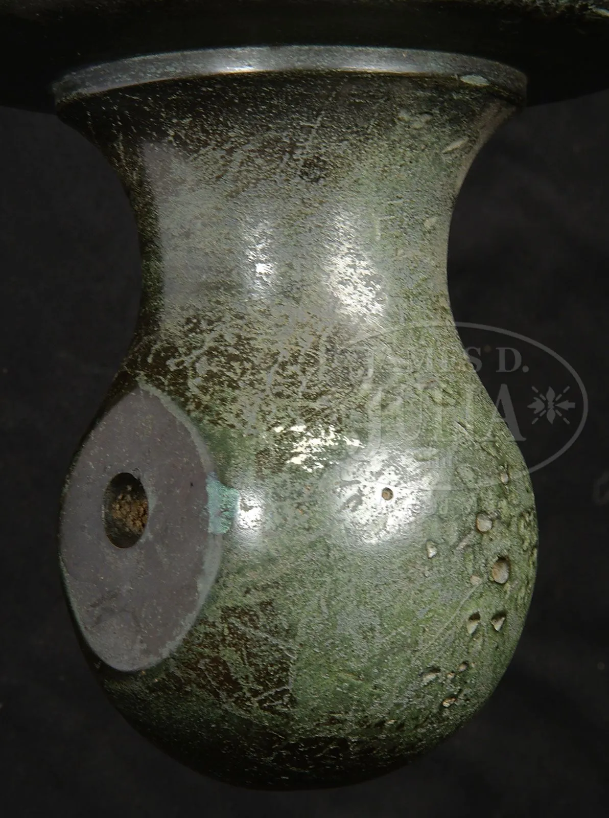 EXTREMELY RARE AMERICAN BRONZE 3-POUNDER CANNON MADE BY JAMES BYERS, SPRINGFIELD CIRCA 1795.SN 8. Only one other James Byers 3-pounder is known to survive. Byers had contracts with the US Government in the 1790s. There is little known of Byers operations other than a handful of invoices and correspondence from that period. The government would later use Byers site in Springfield, MA as the home of our first national armory after urging from Byers in 1800. Design of this cannon is much like the French and English cannon of this era measuring 44-1/2” and about 51” overall with cascabel. This gun exhibits unique cascabel with flattened sides and small dia hole for elevation device that is seen on the few other attributed James Byers cannon. Bore measures just over 3” with flared muzzle, a design which was maintained well into the 1850s. This gun has fine patina totally devoid of marks with exception of SN “8” on right trunnion. There are casting flaws present that would not have been accepted by inspectors in most of the world but the fledgling US government would accept these cosmetic defects on an otherwise fully functional gun. 18th century American made cannon especially bronze are exceptionally rare with no more than a handful of all types surviving. PROVENANCE: Sam Shoupe, NY. Springfield Arsenal, LLC Artillery Collection. CONDITION: Mixed green and brown patina with stains on base where probably removed from concrete mount. There are numerous small dents, dings and scratches as expected after 200 years. Vent is plugged and there are remains of three holes where later firing mechanism had been added. Bore is smooth. 4-54196 JS256 (20,000-30,000) – Lot 1392