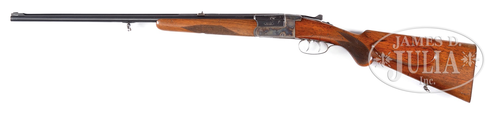 SN 1085. Cal. 32 WIN SPL. 23-1/2″ full rib bbl with express rear sight, rib has been drilled and tapped. Case colored action has border engraving, double set triggers, cocking indicator and tang safety, European walnut stocks with flat point checkering, pancake cheekpiece and smooth metal case hardened buttplate. CONDITION: Good to very good. Bbls show scattered nicks and dings from handling as does wood, case hardened receiver with much hardening color remaining. Mechanics crisp, bore bright and shiny, action tight. 50328-1 JWD (1,500-1,900) C&R – Lot 1393