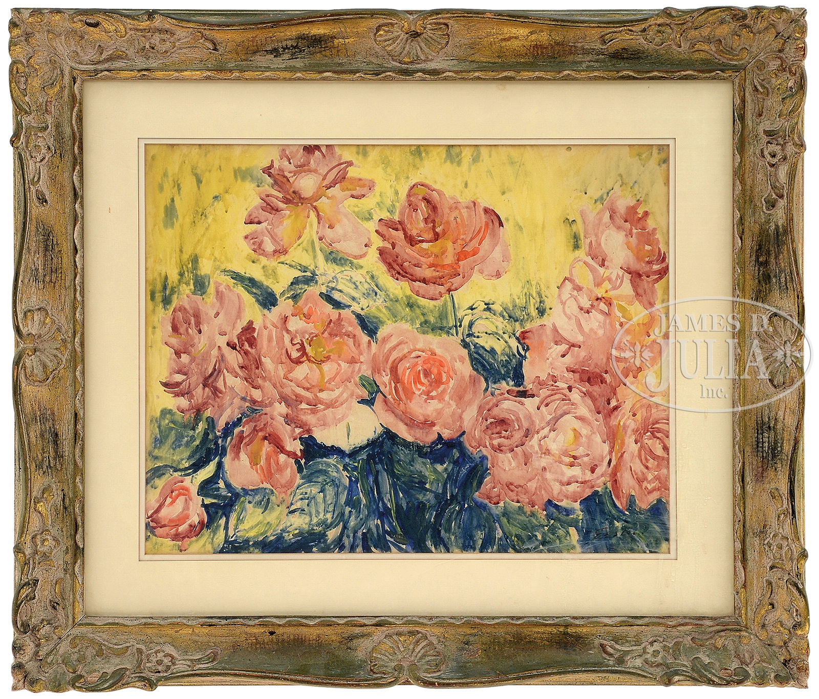 SIR JACOB EPSTEIN (American/English, 1880-1959) ROSES IN BLOOM.Watercolor and gouache Housed in a carved giltwood frame, matted under glass Signed lower right “Epstein” Note: Epstein was best known for his expressionist figurative sculptures. He was born in New York City, however, became an English citizen in 1907 after moving to London in 1905. Epstein married Kathleen Garman in the 1920s and was knighted in 1954 SIZE: Sight: 17″ x 21-3/4″. Overall: 28″ x 33″ PROVENANCE: Acquired in 1950 by descent from the niece of the artist CONDITION: Good overall condition, not examined out of frame. Old acidic mat and cardboard backing indicate this has not been out of it’s frame for some time. Small 1/4″ blemish upper right corner 50390-1 (3,000-5,000) – Lot 1395