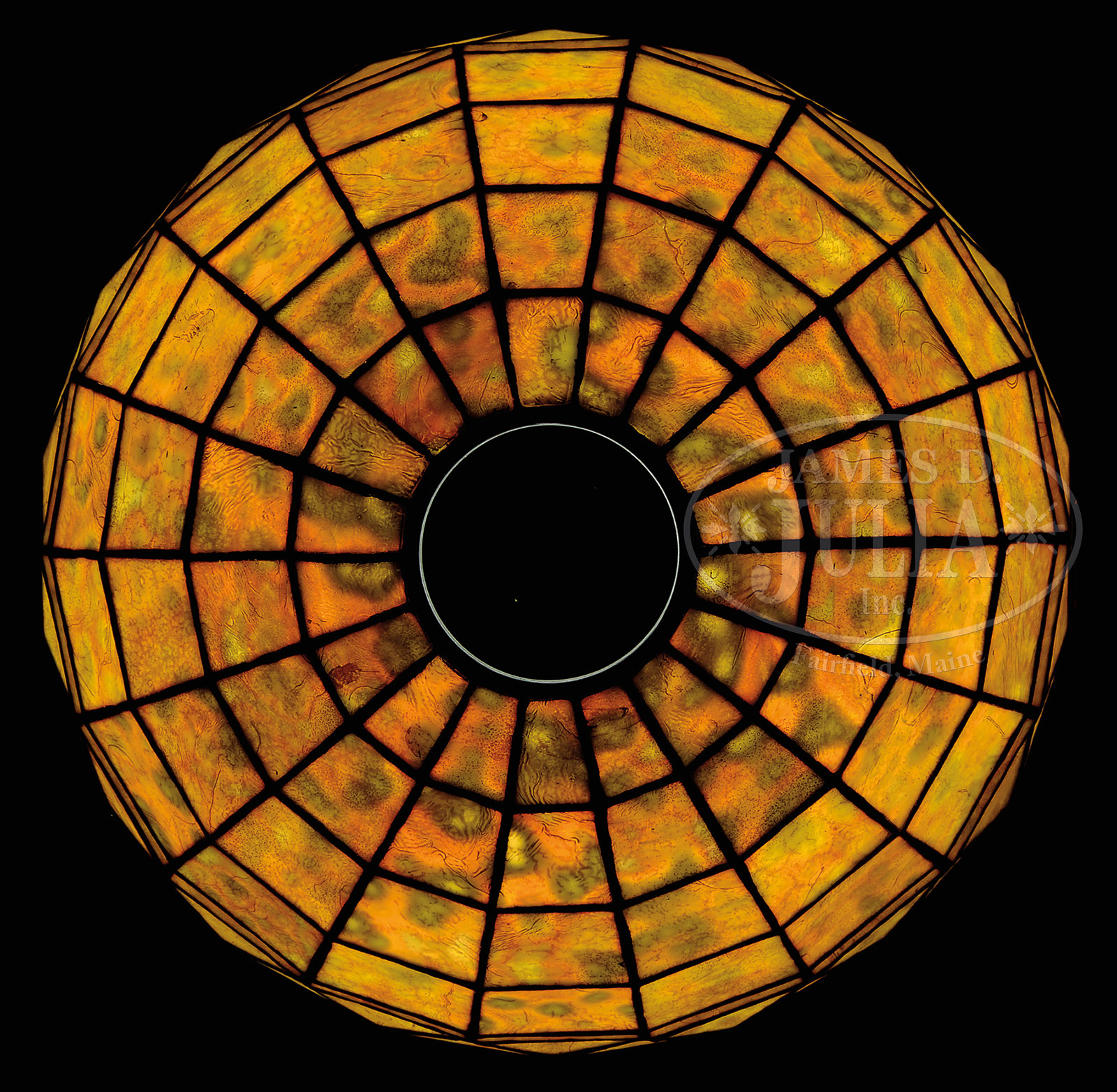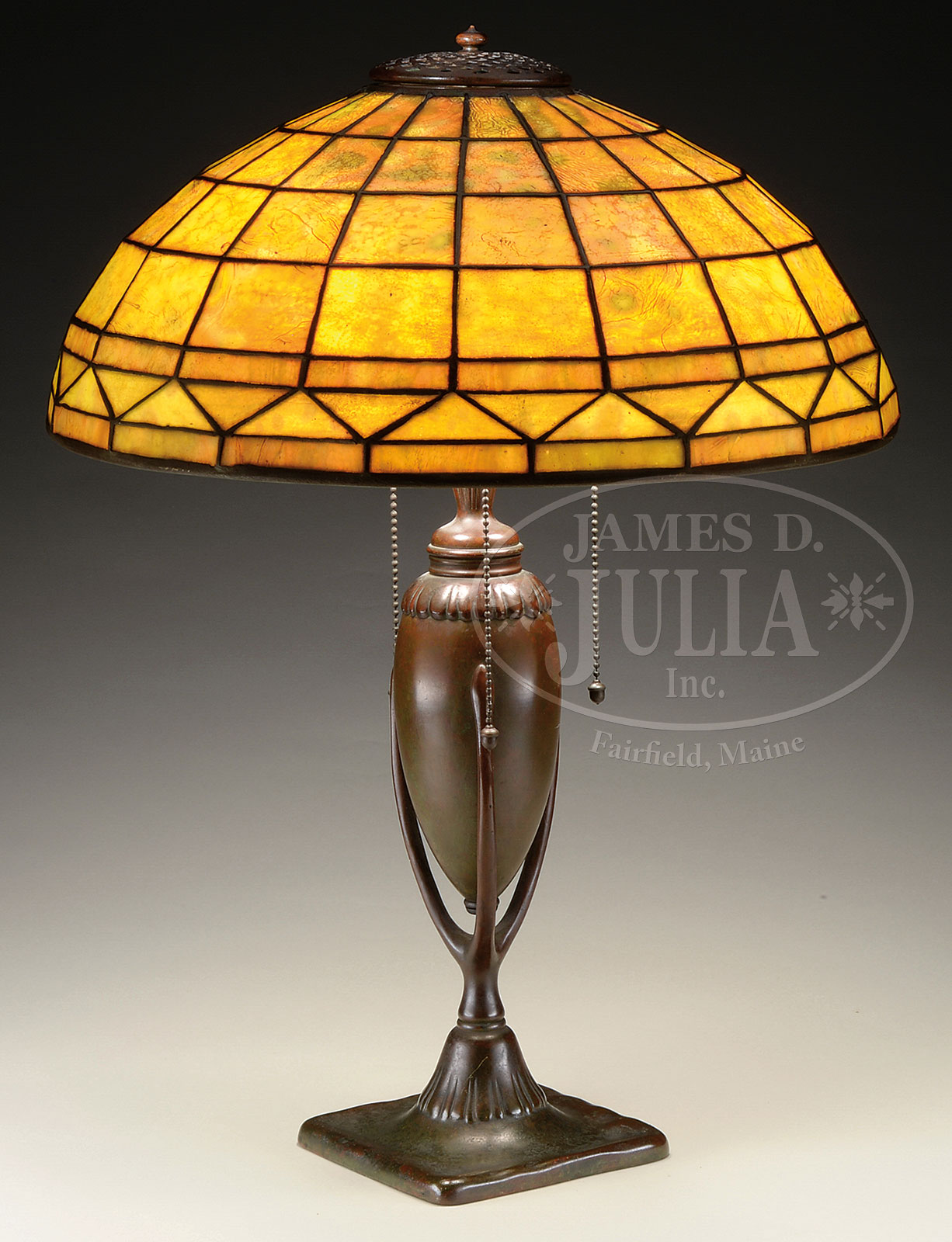 Please Note: Cataloged as very good to excellent. Shade shows evidence of old solder repair near aperture and light scratches on the base, cap is slightly bent, and a rectangular border tile in the shade has a shard of missing glass that does not extend into the interior. Also, printed catalog main photo is the unlit shot, online catalog shows the lamp lit. TIFFANY STUDIOS COLONIAL TABLE LAMP.Tiffany Studios table lamp has leaded glass shade in the Colonial pattern with geometric panels in heavily mottled yellow and cream colored dichroic glass. The glass is yellow and cream when unlit and fiery orange when lit. Shade is signed on inside rim “Tiffany Studios New York”. Shade rests on a Tiffany Studios bronze base with square foot and bullet shaped body cradled in a 3-prong support. Base has a 3-socket cluster and acid etched Tiffany Studios heat cap. Signed on underside with applied round tag “Tiffany Studios New York 444”. SIZE: Shade 16-1/4″ dia. Lamp 22-1/4″ t. CONDITION: Shade is very good to excellent with a few tight hairlines, no missing glass. Base is very good to excellent with some minor wear and discoloration to patina. 51923-1 (6,000-8,000) – Lot 1395