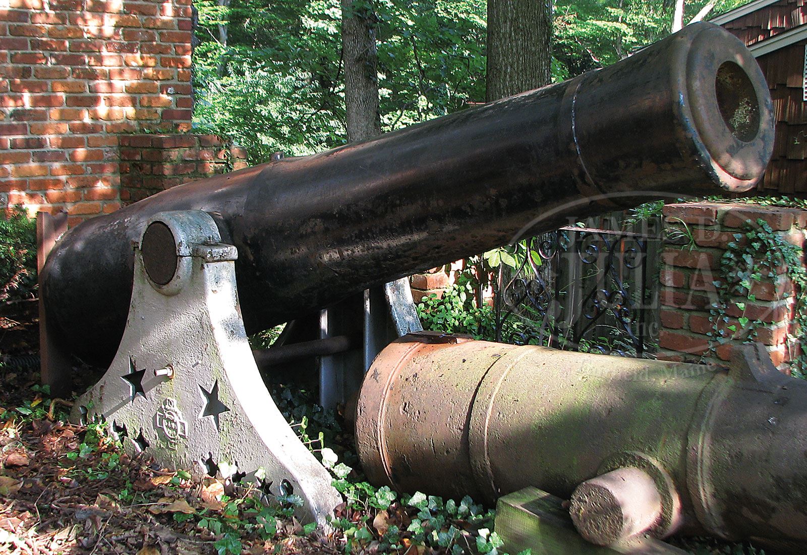 MASSIVE 5-TON PATTERN 1844 8-INCH COLUMBIAD SEACOAST SIEGE GUN.SN NSN. Of the 61 8-inch Columbiads, pattern 1844 made by Cyrus Alger & Co. only 21 survived and this is the only example in private hands. This gun is beautifully marked and at a mere 5 tons of unique American history would make a marvelous addition to any collection where one could brag that my gun is bigger than your gun. This gun conforms to other guns of pattern measuring 119″, 124″ including cascabel. These seacoast Columbiads were America’s first line of defense against naval attack as these guns could easily sink most any vessel coming close enough to take direct shots and that is the reason most all harbors in the world had forts. This particular gun is marked on muzzle face “B.H.” (for ordnance inspector Benjamin Huger who later became a Confederate General) and registry number “44”. Left trunnion is dated “1855” right trunnion is marked, “C.A. & CO / BOSTON”. Breech is marked with weight of 9,105 lbs. *SPECIAL NOTE* This cannon is not at our facilities. It currently resides on the front lawn of John Morris’ home in Springfield, VA, 703-309-0228. It is illustrated and described here and can only be viewed at the above address. If you wish to view it, please call John Morris to set up a mutually convenient appointment to examine. Mr. Morris also has an extraordinary depth of knowledge of cannons in general and in addition to viewing the cannon in person, it will provide you an opportunity to speak with him and access any information that may be helpful to you regarding the cannon. This cannon will stay on Mr. Morris’ lawn until such time the winning bidder has paid for his purchase and made arrangements for the pickup of the cannon. Mr. Morris is experienced in moving heavy cannons and will advise and assist buyer or buyer’s carrier in loading them on vehicles for highway transportation. To repeat, this cannon cannot be previewed at the auction site. PROVENANCE: Allentown, PA LLC. Springfield Arsenal, LLC Artillery Collection. CONDITION: Pitted overall but markings all discernible as can be seen in photographs. 4-54190 JS281 (40,000-60,000) – Lot 1398 Click here to view provenance