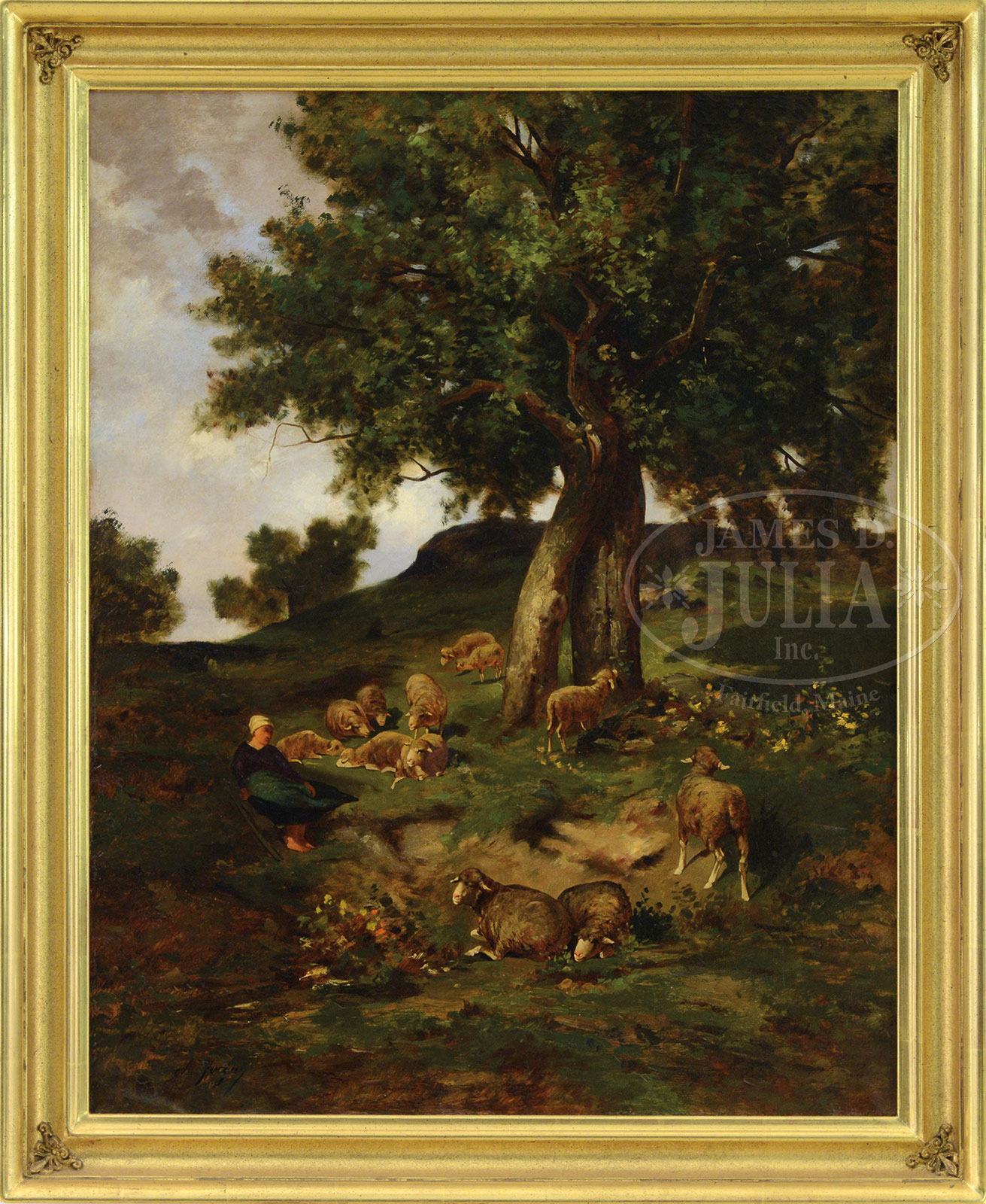 ATTRIBUTED TO CHARLES EMILE JACQUE (French, 1813-1894) SHEPHERDESS RESTING BENEATH A TREE.Oil on canvas Housed in a contemporary giltwood frame Signed lower left “Ch. Jacque” SIZE: 31-1/2″ x 25″. Overall: 36″ x 29-1/2″ CONDITION: Good restored condition, scattered retouch in sky upper left and in foreground, 3″ area restoration center, and a 4″ vertical restored tear in tree foliage. 52133-1 (1,500-2,500) – Lot 1399