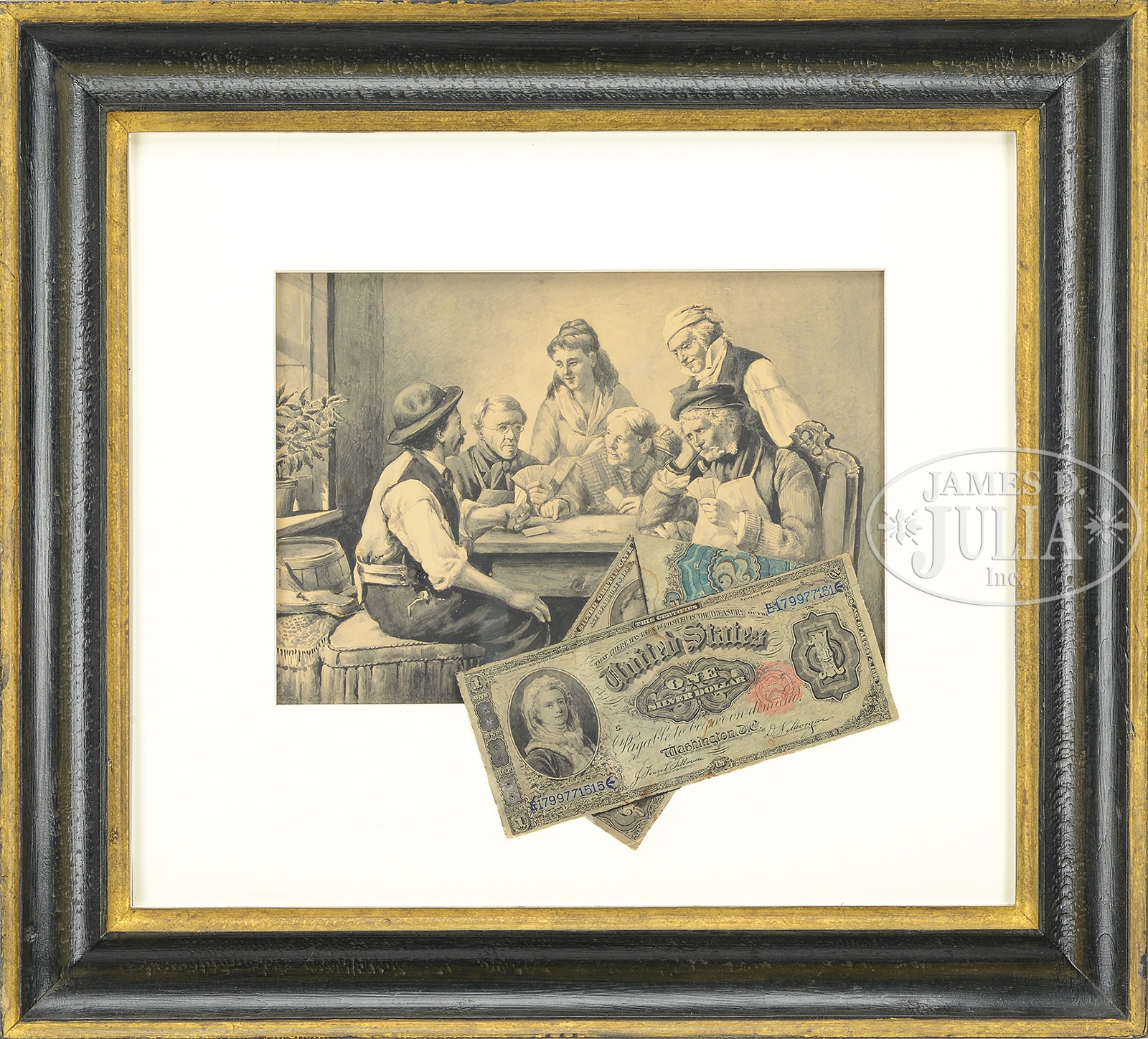 Watercolor collage Housed in a modern black & gold antique style frame with white mat Unsigned NOTE: This original piece actually has two hand watercolor simulated pieces of currency that overlapped the original mat & in front of the watercolor of the people playing cards. The original mat was painstakingly separated and replaced to conserve the picture. Close examination of both the card players & the currency show a remarkable sense of detail & accuracy. Certainly of the talent of Victor Debreuil or John Haberle SIZE: Sight including mat: 13-3/4″ x 15-1/2″. Overall: 18-1/4″ x 20-1/4″ CONDITION: Watercolor of card player is very good. The front bill has two short tears on left & right corners (most likely a result of the conservation). There is an evident waterstain outline which may be intentional by the artist 50807-12 (2,000-3,000) – Lot 1400