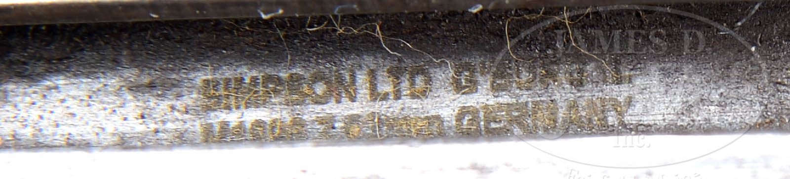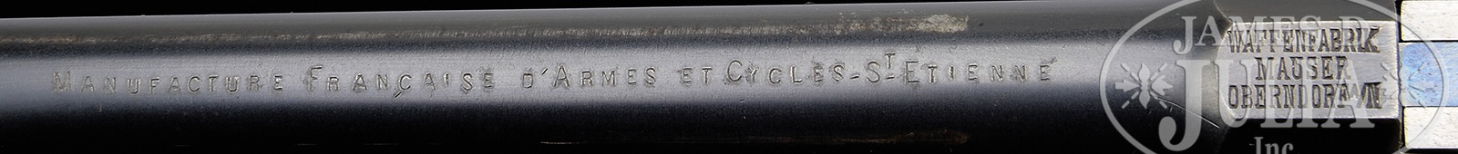 *◊ EARLY MAUSER C96, EARLY SMALL RING WITH LONG EXTRACTOR, FRENCH DISTRIBUTOR, MATCHING STOCK.SN 37122. Cal. 7.63MM. One of a small number of Pre-war Commercial C96s with small ring hammer but retaining the long extractor. Standard 5.5″ bbl having fixed front sight and slip-in 50-1000 rear sight. In addition to the usual chamber markings the top of the bbl is marked “Manufacture Francaise d’Armes et Cycles-St. Etienne”. Right side of frame with a standard 2 line address. Full serial number on sub-frame and frame with all appropriate small parts matched to the last 3 digits of the serial number. Major components rust blued. Fire blued, extractor, cursor, bolt stock, safety & grip screw. Strawed trigger. Special order fine checkered wood grips with the bottom of the right panel marked “9399” by the French distributor as is also found on a number of Mannlicher M1905 pistols. Lanyard ring present. Orig Mauser stock matched to the last 3 digits of a pistol, but likely a replacement as most pistols in this serial range would have had their lug matched with the full serial number. PROVENANCE: The Friedrich-Wilhelm Dauphin Collection, Germany. CONDITION: Approximately 90-95% bright orig rust blue with most wear in front of magazine well and the front strap that has largely toned. Dull bore with shallow rifling. Bolt will not retract all the way to hold open. Manual mechanics otherwise perfect. Good re-varnished stock with several cracks and excellent rough milled lug numbered “122”. Very desirable configuration with French retailer markings and special order grips. 49829-121 LMA (3,000-5,500) C&R – Lot 1400