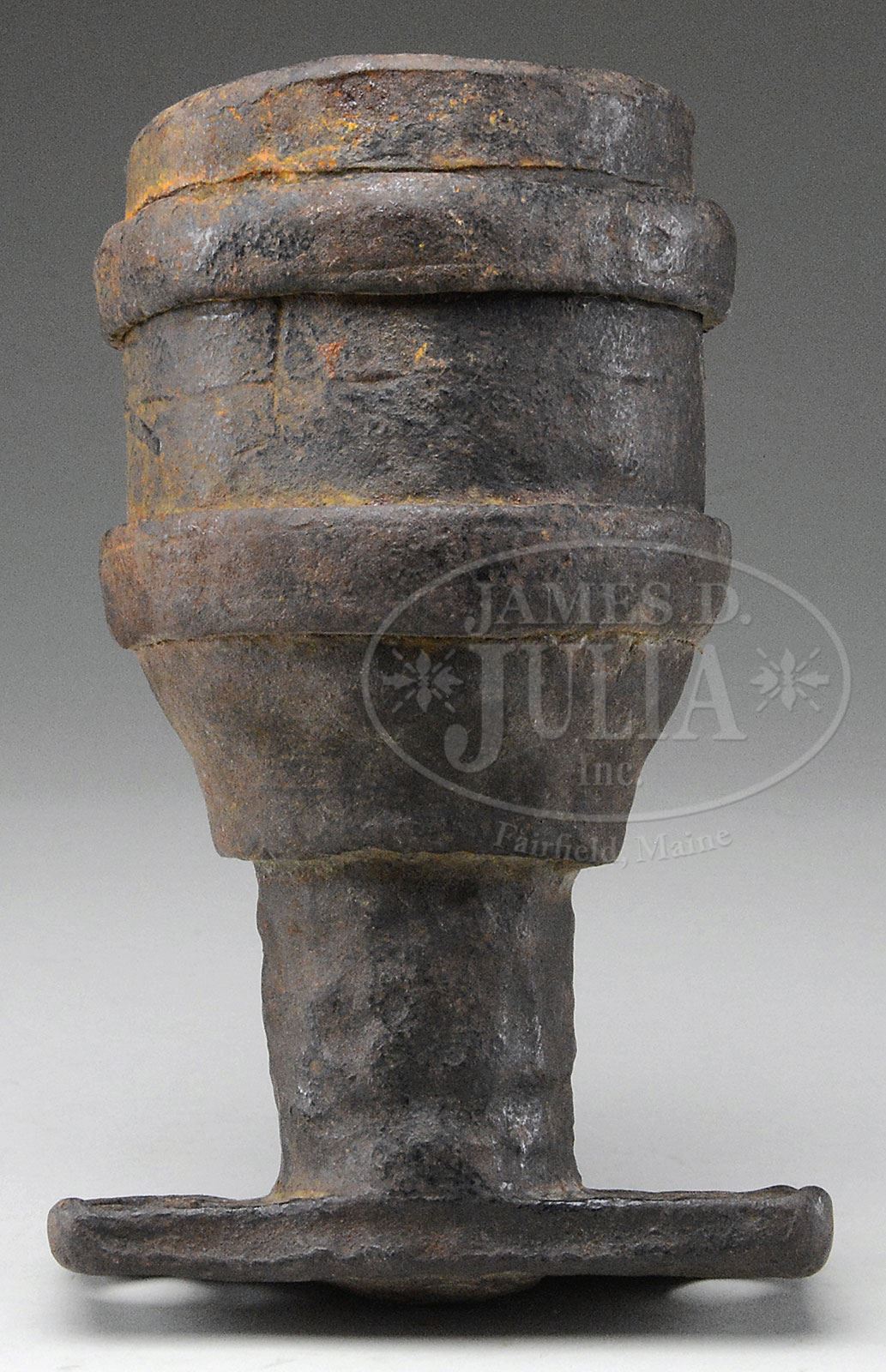 REVOLUTIONARY WAR ERA WROUGHT IRON MORTAR.SN NSN. This mortar measures 10″ overall with a 4-1/4″ bore with wrought iron band reinforcements and appears quite crude but functional. Most likely saw action in some war though it is difficult to ascertain country of origin although it did come from the Hampton P. Howell, Jr. Collection which specialized in early American cannon. PROVENANCE: Hampton P. Howell, Jr. Collection. Springfield Arsenal, LLC Artillery Collection. CONDITION: Iron patina pitted overall, slightly asymmetric either from use or manufacture. 4-54122 JS277 (1,500-2,500) – Lot 1401