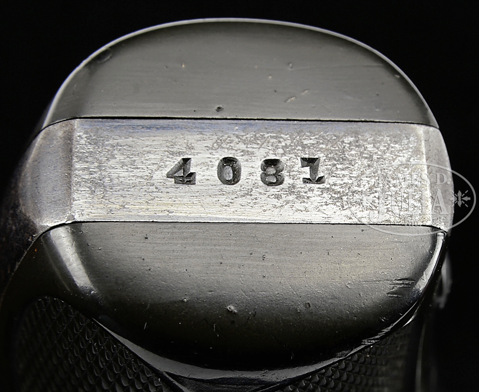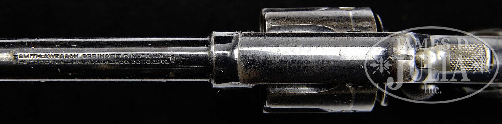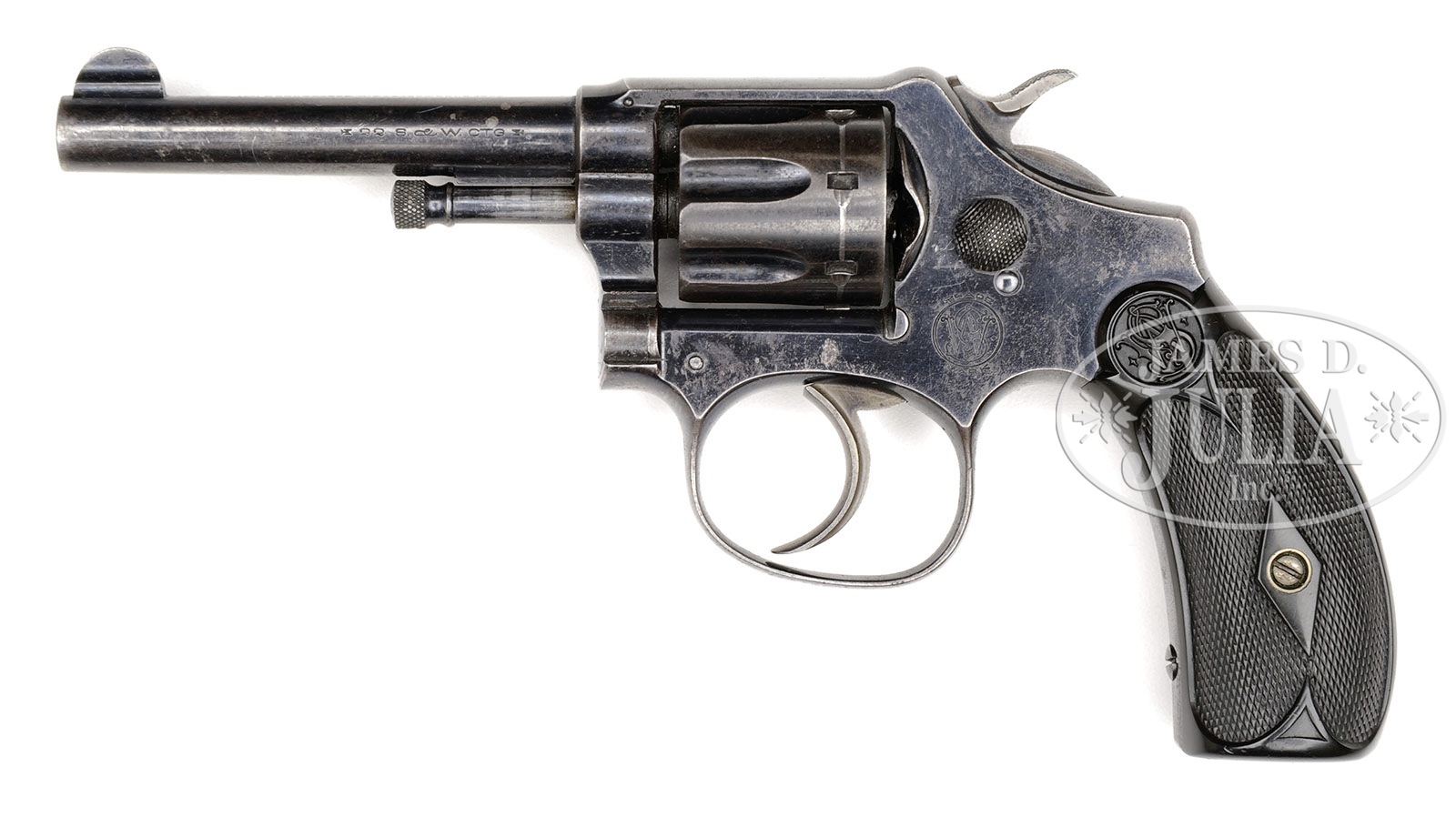 *SCARCE SMITH & WESSON 1ST MODEL LADYSMITH DA REVOLVER.SN 4081. Cal. 22 Long. Blue finish with 3″ bbl, integral half moon front sight and fixed rear sight in the top strap. Bbl has 2-line address with caliber marking on left side. Left side of frame has a checkered cyl release button and the Smith & Wesson trademark logo. Mounted with 2-pc diamond checkered black hard rubber grips with S&W logo at the top. Accompanied by a Smith & Wesson factory letter which identifies this revolver with blue finish, 3″ bbl and checkered black hard rubber grips, shipped Sept. 11, 1905 to Norvell Shapleigh Hardware Co., St. Louis, MO. According to Flayderman’s Guide to Antique American Firearms there were about 4,575 of these small revolvers produced during the period 1902-1906 in three bbl lengths and two finishes. These revolvers were designed by Daniel B. Wesson, one of which he used as his personal protection weapon. They were very popular with ladies & gentlemen who wished to have a small, concealable revolver. PROVENANCE: Tommy Rholes Estate Collection. CONDITION: Fine, all matching including grips. Overall retains 70-75% orig blue, a little thin on the bbl and flaked on the sideplate with light flaking also on the left side; cyl retains strong blue in the flutes, turning plum on the outer diameter; front strap & trigger guard retain strong orig blue with the back strap a blue/brown patina, showing wear at the heel & top end; hammer retains strong case colors, as does the trigger on the sides, faded on the face. Grips show light diamond point wear. Mechanics are fine, bright shiny bore; forcing cone is intact. 4-50732 JR278 (1,500-2,500) – Lot 1402