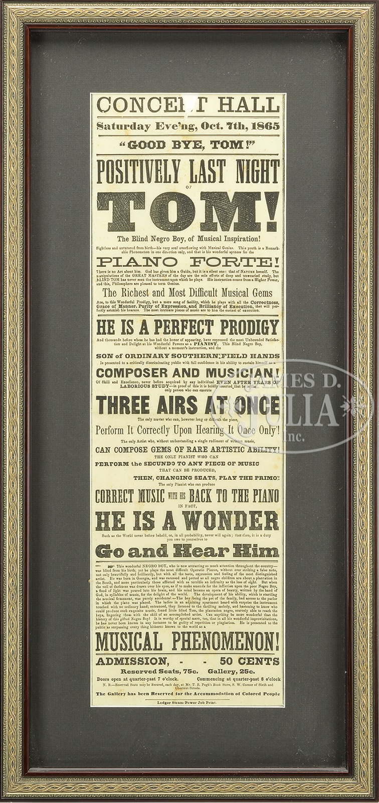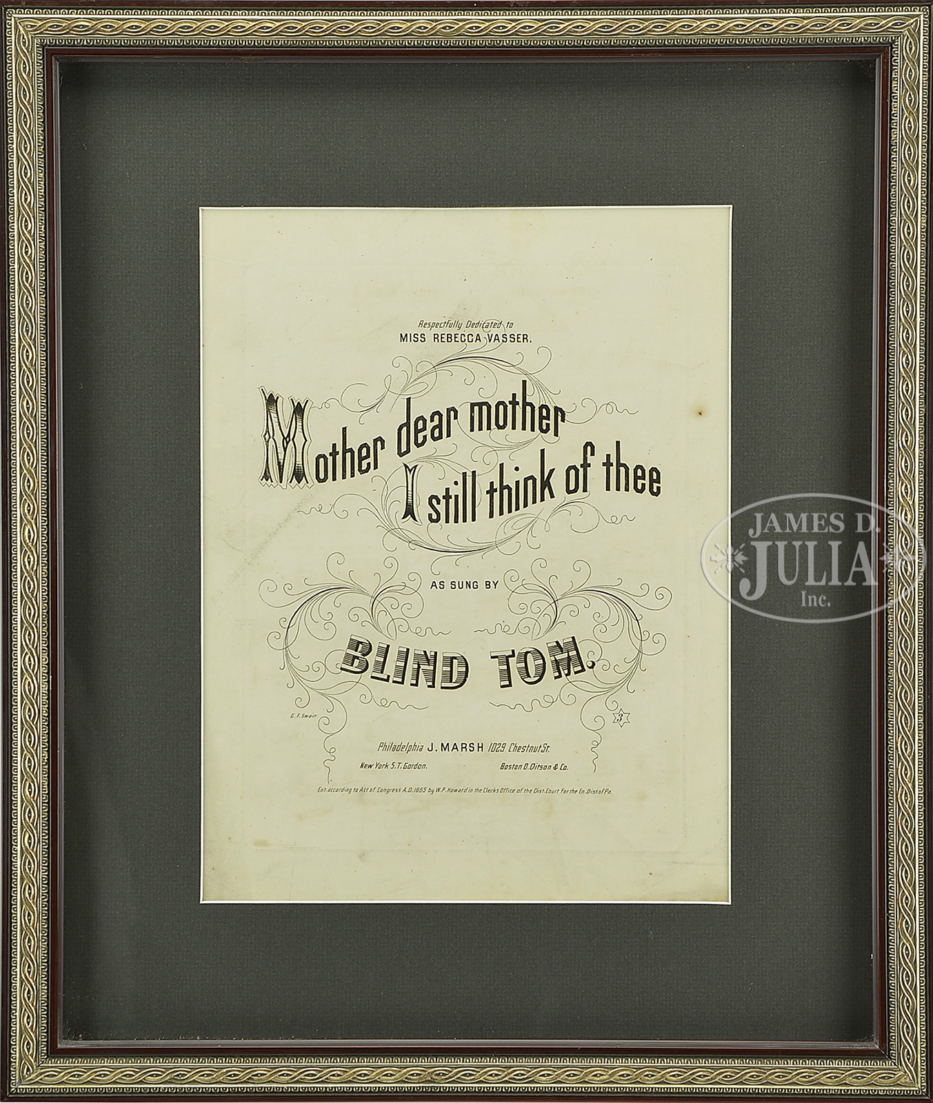 FABULOUS AND IMPORTANT “BLIND TOM” “THE SLAVE MUSICAL GENIUS” ARCHIVE.Blind Tom, born a slave in Columbus GA was a piano virtuoso who amazed the American public with dazzling feats of mimicry and memory of the most sophisticated pieces of music ever written. He could sing in German, French and English at the age of 10 years old. There are at least 4 scholarly biographies written about Blind Tom, nee Thomas Greene Wiggins 1849. One of Tom’s biographers, Geneva H Southall states in her 1999 biography “Blind from birth he was a “throw-in” as a bargain when Colonel James Neil Bethune, a highly respected Columbus GA lawyer and newspaper editor who purchased his parents Charity and Mingo Wiggins and two of his brothers at a slave auction in 1850… Tom demonstrated his aptitude for music from his 4th birthday, having slipped unnoticed to the piano and picked out several tunes he had heard played by the Bethune daughters, all of whom were accomplished musicians. After that revelation Tom became something of a “household pet” with all members of the family… One can assume that Tom received a solid theoretical and technical music foundation. His progress was such, by the time of his 6th birthday, he had become a ‘prized possession’ with the Bethune children proudly exhibiting him to their neighbors.” Of the reported 20 children of Charity and Mingo, only Tom had any musical ability or was autistic. Tom had his first public appearance at the Columbus Temperance Hall on October 7th 1857. Within a year Tom was so famous that his owner was being paid royal sums for Tom to perform all over the south. At the Civil War’s end and freedom given to southern slaves Colonel Bethune made a deal with Tom’s parents paying them such that he could continue to be Tom’s guardian and toured with him all over the world making immense wealth for him but little for Tom and his parents. This archive with over 50 pieces of original sheet music, broadsides and photographs chronicle his life. There are 2 Columbus newspapers, October 10th and 14th 1862 advertising soldiers aid concerts hosted by Tom. It was noted in Ms. Southall’s biography that Tom must have been quite aware of the war and politics because at one of these Confederate events he played on the piano Dixie with one hand, Yankee Doodle with the other while singing “The Girl I Left Behind” at the same time. Included are over 20 pieces of sheet music, mostly 19th century dating from 1865. There are 3 broadsides, one with a large vignette of Blind Tom most likely used in one of the many concert halls he performed. There are 8 photographs from life, CDV’s and cabinet cards. There is a requested signature of Tom where his “mark” was sent. There are 6 versions of early biographies “Sketches of the life of Blind Tom” printed beginning in 1867 with several variations printed in the US and England from 30-55 pages. There is a December 1865 phrenological journal which studies the shapes of heads of luminaries from George Washington to Julius Caesar and a full page on Blind Tom. Blind Tom was no doubt among the most famous performers and pianists of his day. His last public performance was in 1905, he died in 1908. His New York Times obituary June 15, 1908 was not glowing about the true genius that Tom Wiggins is known to have had today, and there was no mention of his exploitation throughout his life or that his earnings in today’s money would be the equivalent of many millions of dollars, though he saw little of it and died penniless. Obituaries were published nationwide and black newspapermen were quick to report the almost lifelong slavery that he endured. It is also interesting that Blind Tom is possibly the only person to have 2 obituaries in the New York Times, when he was first reported killed in the Johnstown flood of 1903 and somebody was buried in a tombstone placed on his grave. There are several magazine and newspaper articles also accompanying this group from the 1860’s Harper’s Weekly to he Ladies Home Journal of 1898 and other later editions concerning Blind Tom. There are also 2 large notebooks with biographical research and correspondence prepared by George Greene. This is no doubt by far the largest grouping of Blind Tom memorabilia ever assembled and took almost an entire room to display in the Greene Museum. Also accompanying are several large reader boards from the museum. PROVENANCE: From the Greene Museum of Southern History. CONDITION: Fair to excellent. Prospective purchasers should inspect. 9-28019 (10,000-20,000) – Lot 1402