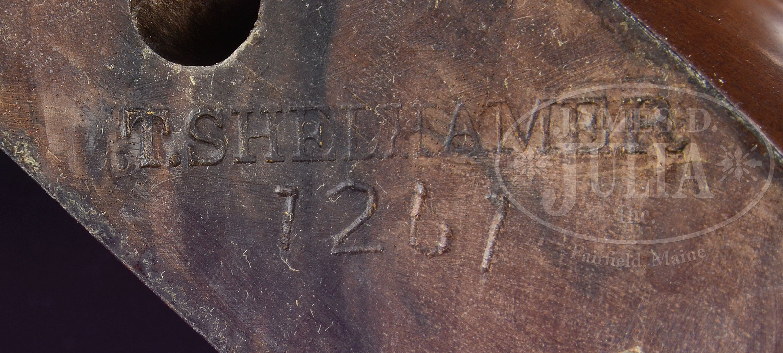 *WONDERFUL LITTLE BABY FARQUHARSON CUSTOM VARMINT RIFLE, MOST LIKELY BY NEIDNER, HAVING SUPERB STOCKS BY THOMAS SHELHAMER WITH SCOPE.SN 1607. Cal. .218 BEE. 26″ Tapered round bbl has some well cut open shaded scroll engraving on top where name would normally be found and at muzzle with matching scroll on tops of soldered on scope mounts. Scope is an early Weaver J 2.5 scope with crosshair and post reticle. Caliber is in gold on left side and SN is in gold on right. Very rare miniature P D Farquharson single shot dropping block action has side safety (SAFE inlaid in gold). Action is engraved with 80% coverage varying sized open shaded scroll, which appears to be by the same hand as that on bbl (possibly Kornbrath). Beautifully marbled European walnut capped pistol grip buttstock measures 13-1/4″ over case hardened Neidner checkered buttplate. Removal of buttplate reveals T. Shelhamer’s stamp and stock no. “1261”. Stock is of classic Shelhamer style with raised chinstrap transition of flawlessly checkered grip to butt, and large swept shadow line rollover cheekpiece. Grip cap is of engraved steel matching action, and has trap. Matching long slim forend with horn tip, screws to bbl. CONDITION: Excellent, retaining nearly all of its fine custom finishes with only a few light handling marks in wood. Bore is excellent. Scope is excellent, optically clear. 51783-1 MGM182 (7,500-12,500) C&R – Lot 1403 Click here to view provenance