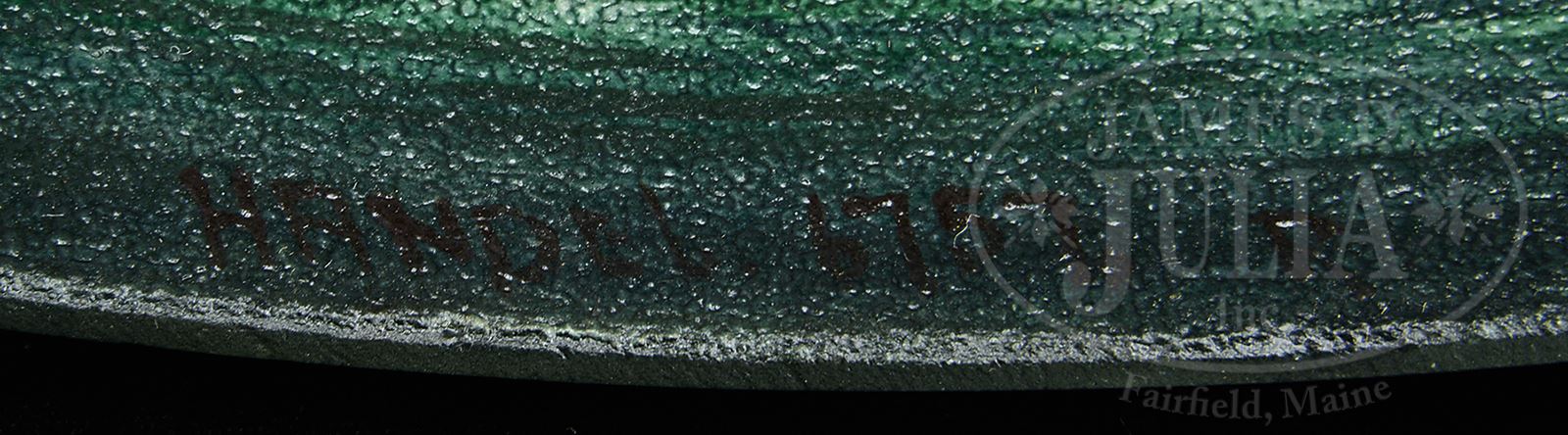 HANDEL VENETIAN HARBOR TABLE LAMP.Handel table lamp has reversed painted dome shade with Venetian harbor scene, showing sailboats in the harbor with Venice in the background all against a cloudy sky with calm waters. Exterior of the shade is finished in chipped ice. Signed on the interior edge “Handel 6757” and artist initial “R”. Shade rests on a Handel base with round foot and body and three applied “S” shaped handles. Base has three socket cluster, fleur-de-lis cap and a rich brown finish. Signed with a affixed “Handel” plate on the interior edge of foot. SIZE: Shade 17-3/4″ dia. Lamp 23-1/2″ t. CONDITION: Shade is very good to excellent. Base is very good with some minor wear to finish. 49566-6 (8,000-12,000) – Lot 1404