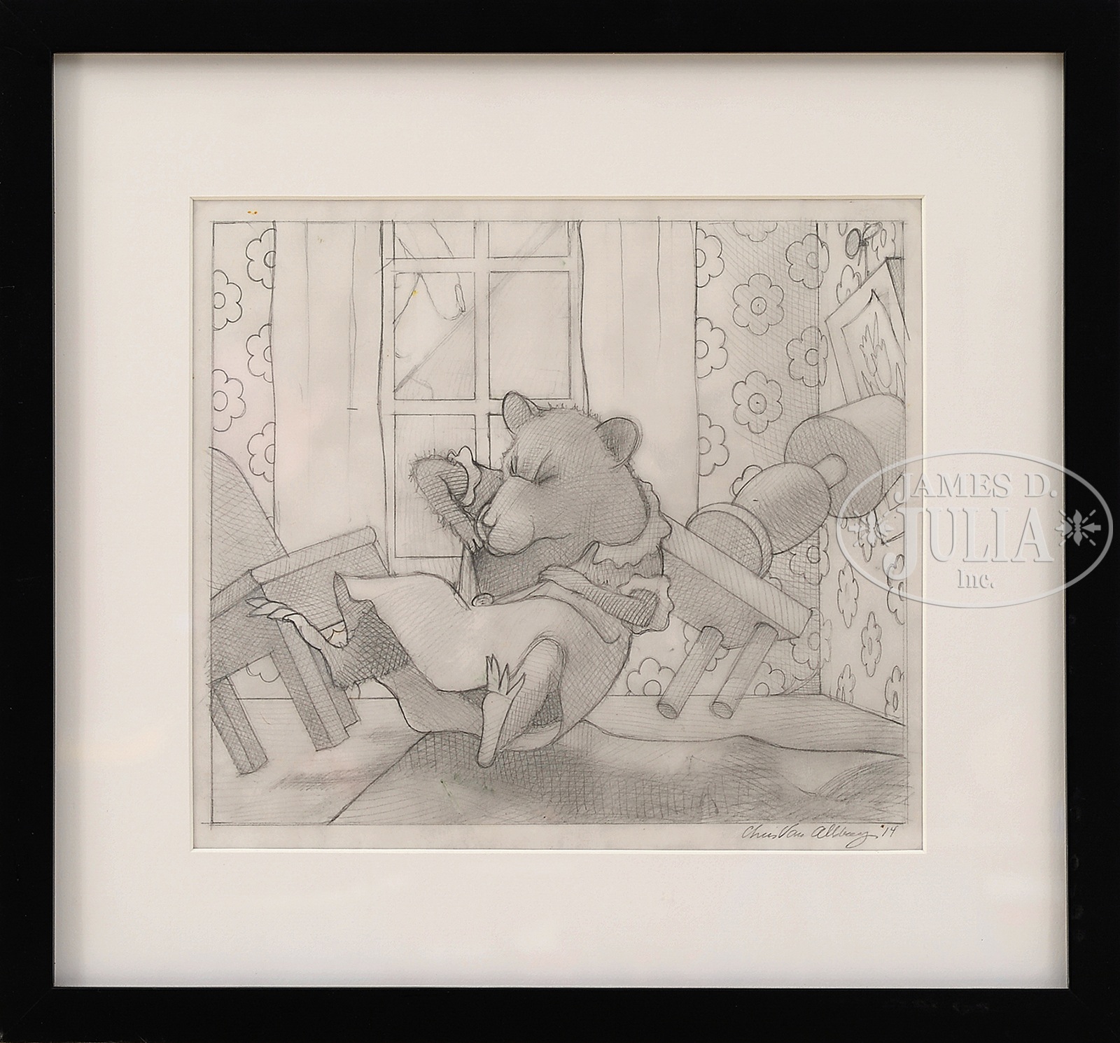 CHRIS VAN ALLSBURG (American, b. 1949) TWO ILLUSTRATIONS FROM “THE MISADVENTURES OF SWEETIE PIE”.1) Pencil sketch on vellum Signed and dated lower right “Chris Van Allsburg ’14” Note: Sketch for the cover illustration of the 2014 book “The Misadventures of Sweetie Pie” by the Caldecott winning author of Jumanji and Polar Express 2) Color print of the book cover Signed lower left “Chris Van Allsburg” Published by Houghton Mifflin. Both housed in a contemporary black wood frames SIZE: 1) Sight: 8-1/2″ x 9-1/2″. Overall: 14″ x 15″ 2) Sight: 16-1/2″ x 15-1/2″. Overall: 17-1/8″ x 18-1/8″ CONDITION: Both are in very good to excellent condition 50217-1 (1,000-1,500) – Lot 1404