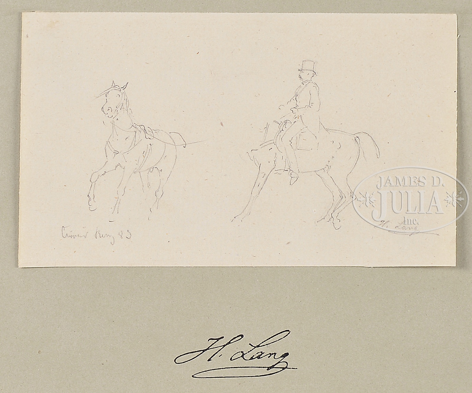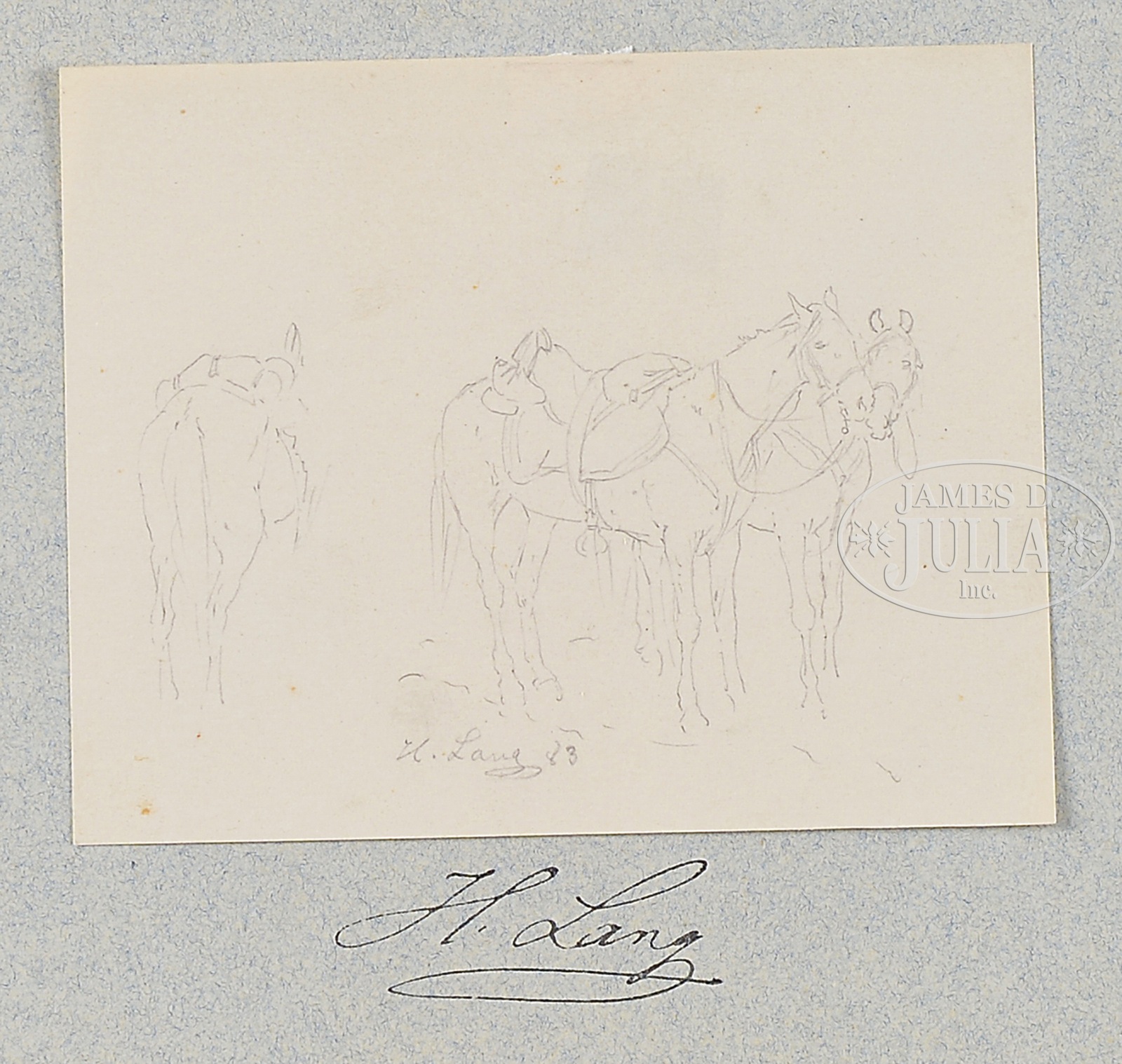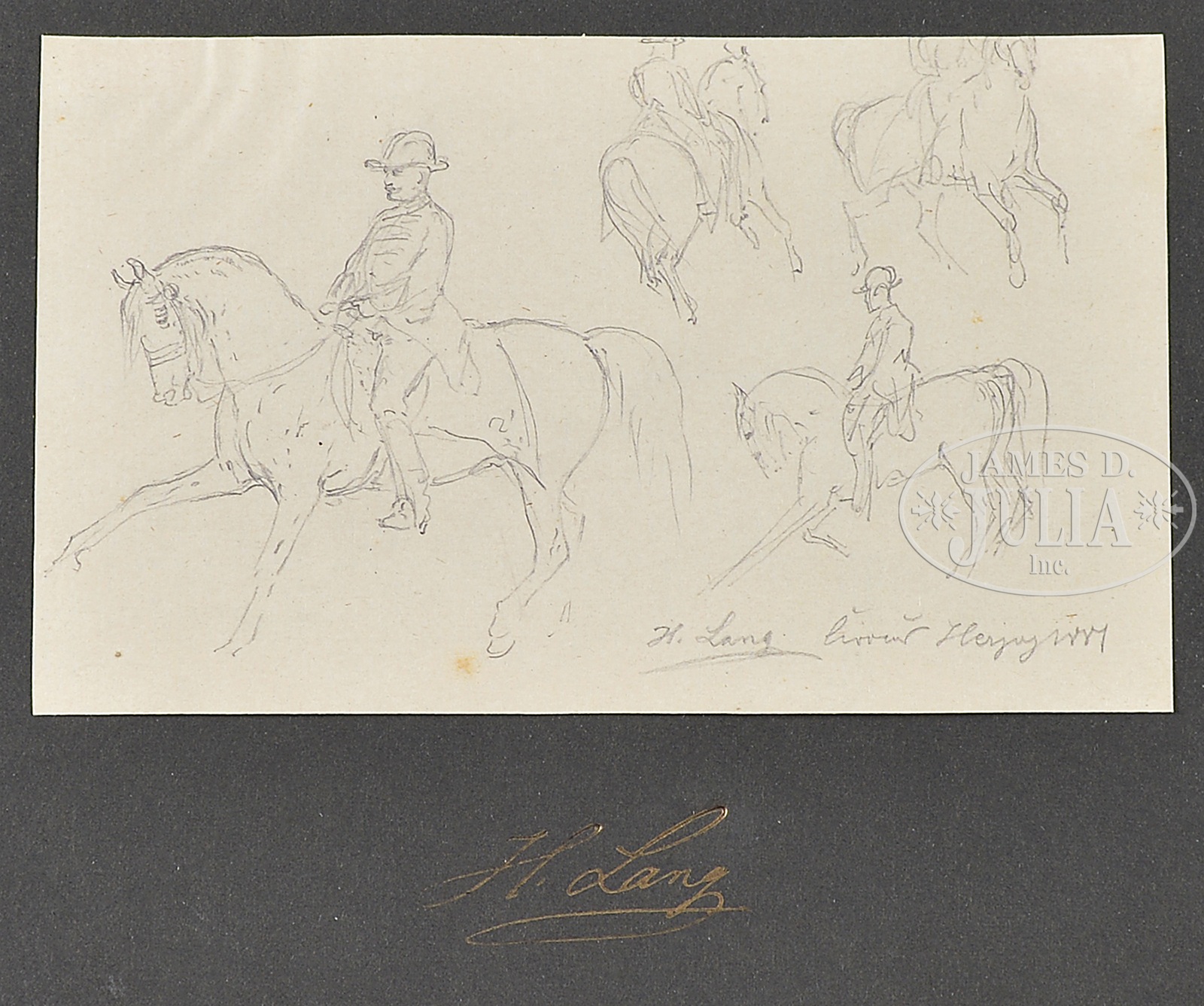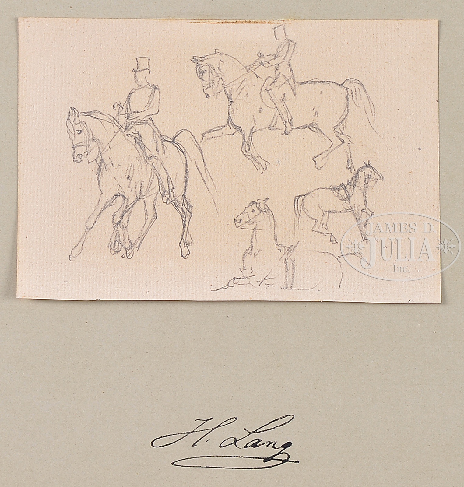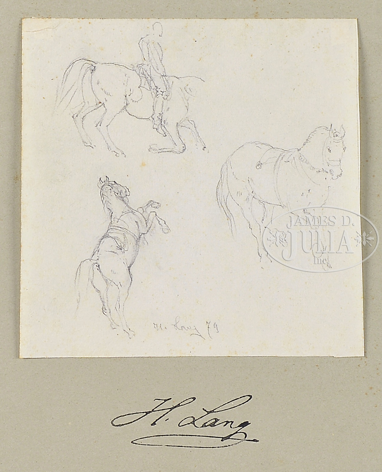 HEINRICH LANG (German, 1838-1891) TWELVE HORSE SKETCHES.Pencil on paper Each mounted to colored cardstock Unframed Signed in drawing, also below on mounting Dated between ’78 and ’88 SIZE: Actual: from 4-1/4″ wide to 7″ wide; from 3-1/2″ high to 4-1/2″ high Cardstock: 9-1/4″ x 12-1/2″ CONDITION: Very good, light toning and foxing 9-93092 (300-500) – Lot 1404a