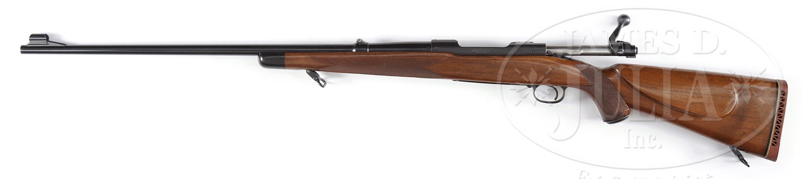 *WINCHESTER MODEL 70 SUPERGRADE BOLT ACTION BIG GAME RIFLE PRE 64.SN 431312. Cal. .300 H&H Magnum. 26″ bbl, blue finish. Checkered walnut stock. PROVENANCE: William Henkel Collection. CONDITION: Fine, bbl retains 98% blue with slight muzzle wear and a slightly plummed finish. Bore is very good with strong rifling. Receiver retains 98% matte blue finish, bolt handle shows 95% blue finish, with some plumming, bottom metal shows 95% blue with a small rust stain at the hinge and slight scratches on trigger guard. Stock is very good with fine factory checkering, ebony forend tip, cheek piece, Winchester quick detach sling swivels and red Winchester buttpad. Very nice Winchester model 70 Supergrade big game rifle. 49394-28 TEP (2,000-3,000) – Lot 1405