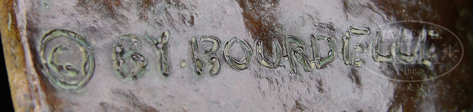 EMILE-ANTOINE BOURDELLE (French, 1861-1929) “MASQUE ENFANT ENDORMI”.Bronze Attached with Velcro to a white marble rectangular base Signed on side at the base “By. Bourdelle” left side is stamped with the foundry mark “E Godard Cire perdue”, “3” Purchased April 8, 1957 from Musee Bourdelle of Paris, daughter of the artist, Rhodia Dufet-Bourdelle (1911-2002). A copy of the receipt & a letter regarding the bronzes purchased accompanies the lot SIZE: Bronze 8″ h x 7-3/4″ w. Overall: 8-1/2″ x 8-1/2″ PROVENANCE: From a Connecticut estate. CONDITION: Very good, fine patina and surface 52228-1 (6,000-9,000) – Lot 1405