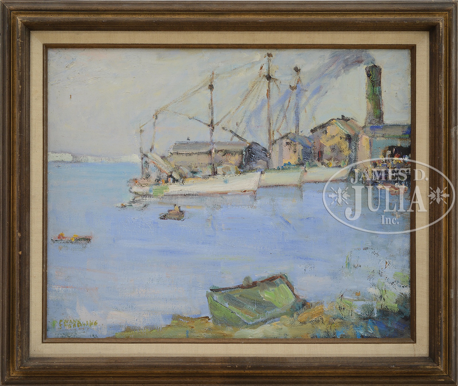 FRANK SPRADLING (American, 1885-1972) “MCLOON DOCKS”.Oil on canvas Housed in a wood frame with linen liner Signed lower left “Frank Spradling”, bears artists exhibition label titled and dated “1972”, inscribed on verso canvas “Frank Spradling #29″ SIZE: 16″ x 20″. Overall” 20-3/4″ x 24-3/4″ CONDITION: Small area of tape residue on paint surface lower right, otherwise good 1105-5 (800-1,200) – Lot 1406