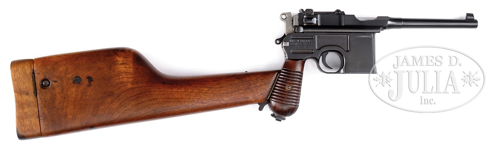 *◊ MAUSER C96 LATE M1930 COMMERCIAL WITH CORRECT STOCK.SN 917710. Cal. 7.63MM. Standard configuration late M1930 Commercial with 5.5″ bbl, fixed front sight and slip-in 50-1000 rear sight. Short extractor and universal safety. Mauser address over chamber. Crown/U proofing on left chamber flat. Solid rails with serial number on bbl extension behind rear sight. Left frame with a large Mauser Banner. Right frame with a 3 line address. All major and minor parts salt blued. Broadly serrated walnut grips. Lanyard ring present. Correct Mauser Banner stock having unnumbered square shoulder lug. PROVENANCE: The Friedrich-Wilhelm Dauphin Collection, Germany. CONDITION: Approximately 98% of careful re-blue with well preserved flat surfaces and sharp markings. Grips with scattered dings, but orig finish. Mirror bore. Perfect manual mechanics. Oil stained stock, lightly refinished small parts covered by patina and cold blue. 49829-156 LMA (1,750-2,500) C&R – Lot 1406