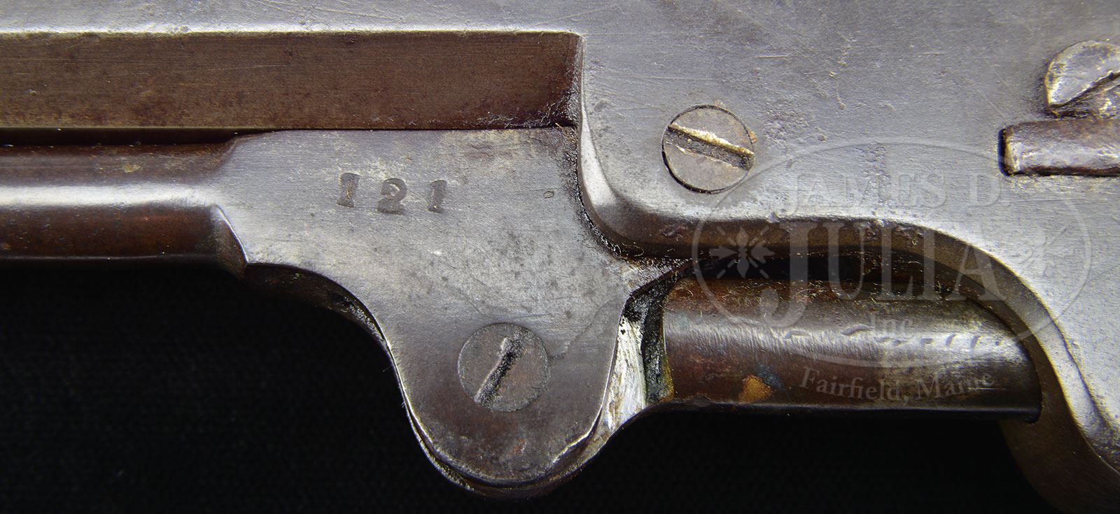 VERY RARE CONFEDERATE OCTAGON BARREL DANCE DRAGOON REVOLVER.SN 121. Cal. 44. Of the approximate 100 Dance pistols that survive, about 85 are 44 Cal. Of these 85 guns, only five other substantiated guns have full oct bbls. These oct bbl guns (SN’s 164, 172 and 247, <> <> <> <> (4 diamonds)) like this example here have fancier burl stocks and is a very fine example. SN 121 is found on all major parts including bbl, loading arm, cylinder, frame, hammer, trigger-guard, and backstrap. Overall edges are sharp. Action is tight and very good. This gun by NRA standards grades good to very good. By Confederate standards this gun is very fine. Dance revolvers saw hard Confederate use, and the men who carried these knew where they were made and were proud to carry one. Gun appears to be orig and authentic in every regard and is much above average of most encountered specimens. All screws, cones, sight and internal parts appear orig, though the wedge is not numbered and appears to be a contemporary replacement still retaining the orig wedge screw, though 1/2 of its head is missing. This gun was originally found by a charter member of the Texas Gun Collector’s Association Vic Frederick. According to Mr. Frederick’s collection card he purchased the gun from an elderly negro woman living near Webberville Texas (East of Austin). He traded a .410 shotgun and a box of cartridges valued at $5.65. This gun is pictured in an early Texas gun collector’s newsletter and remained in the family until his grandchildren sold the gun in 2012. This is a rare Dance revolver that would be difficult to find a better example. PROVENANCE: Vic Frederick, about 1945. Pictured in Dance & Brothers Texas Gunmakers of the Confederacy by Gary Wiggins, 1986. Crockett Keller, 2012. Joseph Murphy Collection, 2012. CONDITION: SNs are all well struck and fully discernible. SN appears on left side of loading arm. Brass backstrap & trigger guard have dark mustard colored patina. Iron surfaces of gun are dark grey/brown with scattered pitting overall. Edge of cylinder shows two fine cut lines which is unusual for Dance revolvers as they normally show one cut line which is a unique Dance feature but oct barreled guns do show deluxe features including a silver front blade sight that have only muted on oct. bbl SN172. Grips show some shrinkage but are well fit to gun retaining strong traces of orig varnish and nice walnut figuring. 8-76401 JS (60,000-80,000) – Lot 1408 Click here to view provenance
