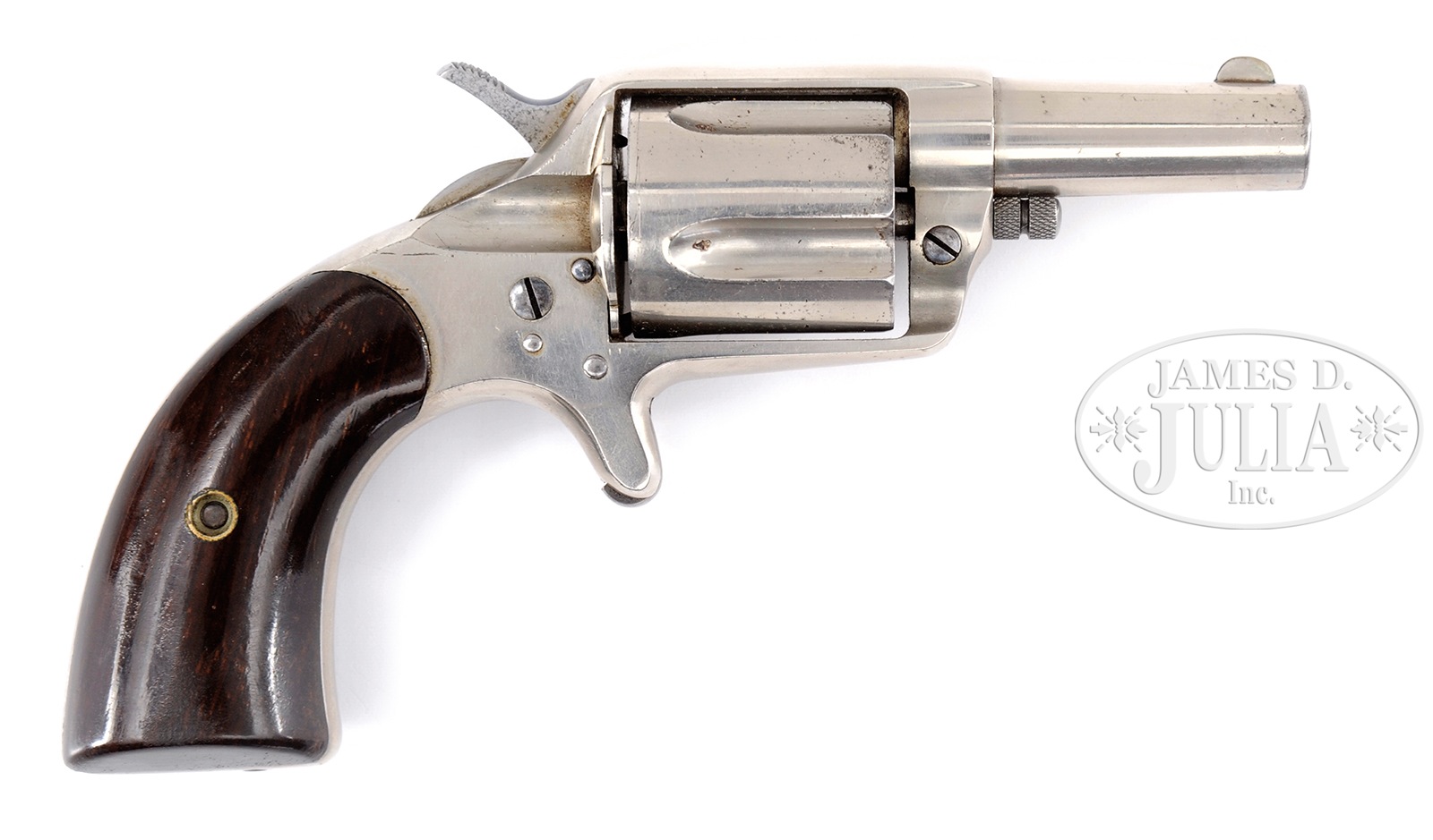 OAK CASED COLT NEW HOUSE 41.SN 25535. Cal. 41 CF. 2-1/4 ” bbl, blade front sight, top strap groove rear, 5 shot cylinder, bbl stamped “New House 41”, rampant Colt in circle above left grip, cylinder is British proofed. Rosewood grips. An orig Colt oak case with compartments, cleaning rod, manufacturer’s label reads “14 Pall Mall, London”. Sales receipt from Jackson Arms, collector’s notes. PROVENANCE: The Dr. Robert G. Cox Estate Collection. CONDITION: 80% orig nickel, some cylinder flaking, nickel has started to dull, hammer has bright fire blue, grips are in very good condition. Case is in good condition. 50019-249 TN (2,500-3,500) – Lot 1408 Click here to view provenance