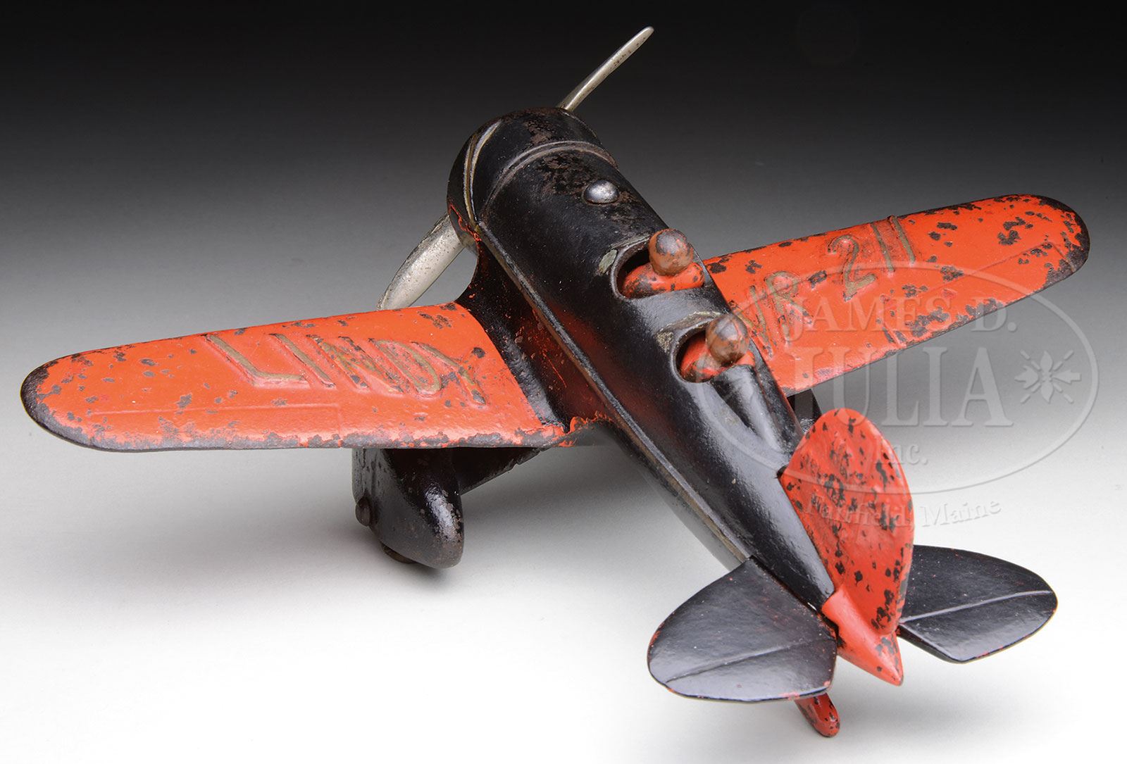 LINDY LOCKHEED SIRIUS AIRPLANE.A classic and highly desirable airplane from the 1930s depicting a dual open cockpitted plane immortalized by Lindbergh. Manufactured by Hubley of Lancaster, PA. This airplane has wings with heavy embossing “Lindy” on the left wing, “NR-211″ on the right wing. Plane is enameled with a black fuselage and a red wing & tail section. The original plane was designed by Jack Northrop and in 1930 he set a speed record from coast to coast, but even more important, he used the same plane to fly to the Orient. Lindbergh modified the plane by putting a canopy over the cockpits, but obviously the Hubley toy Co. chose not to add this feature for obvious reasons. A great plane, not only for its historical value, but also for its desirability amongst toy plane collectors. SIZE: Approx wingspan: 10-1/2” w. CONDITION: Toy is in all original paint finish with no damage to iron castings. Overall is good plus. 1-76384 (1,750-2,750) – Lot 1410 Auction: Advertising, Toy & Doll Auction - Fall 2014 Please Note: All prices include the hammer price plus the buyer’s premium, which is paid by the buyer as part of the purchase price. The prices noted here after the auction are considered unofficial and do not become official until after the 46th day. |