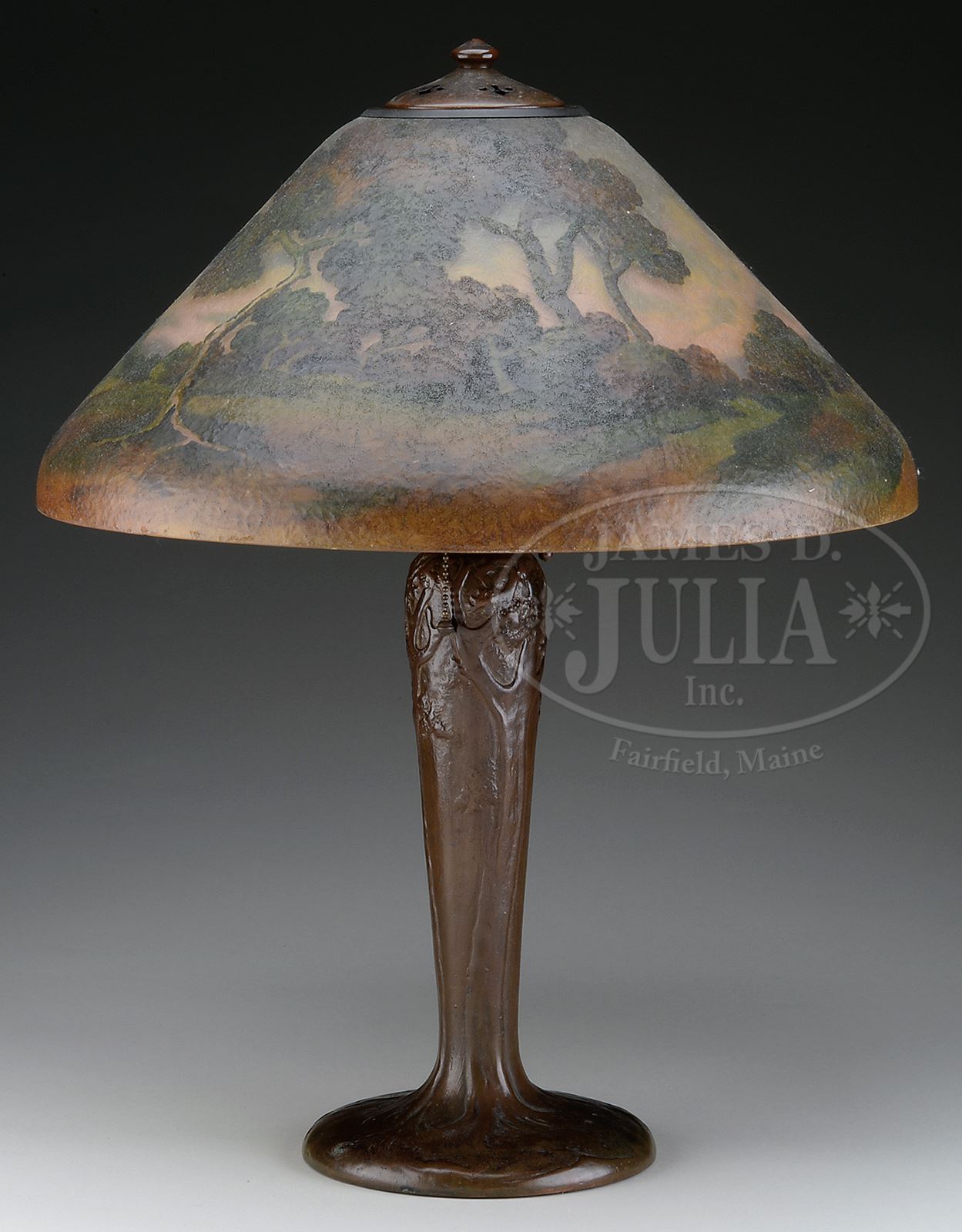 HANDEL REVERSE AND OBVERSE PAINTED TABLE LAMP.Handel table lamp has reverse painted scene of large trees encircling shade against blue, pink and cream colored sky. Trees are further painted on obverse with heavy stylized foliage all against chipped ice background. Heavy obverse painting gives shade the appearance of cameo glass. Signed on interior lip “Handel 5889” along with artist initials. Shade rests on an original Handel base with cast tree decoration surrounding body of base, riser supports three socket cluster and pierced fleur-de-lis heat cap. Base is finished with rich brown patina. Signed on underside with applied cloth tag “Handel Lamps. SIZE: Shade is 18″ dia. Lamp is 23” t. CONDITION: Shade is very good to excellent. Base is very good to excellent with some very minor discoloration and blistering to finish. Re-wired with appropriate cloth cord. 50489-13 (6,500-8,500) – Lot 1410