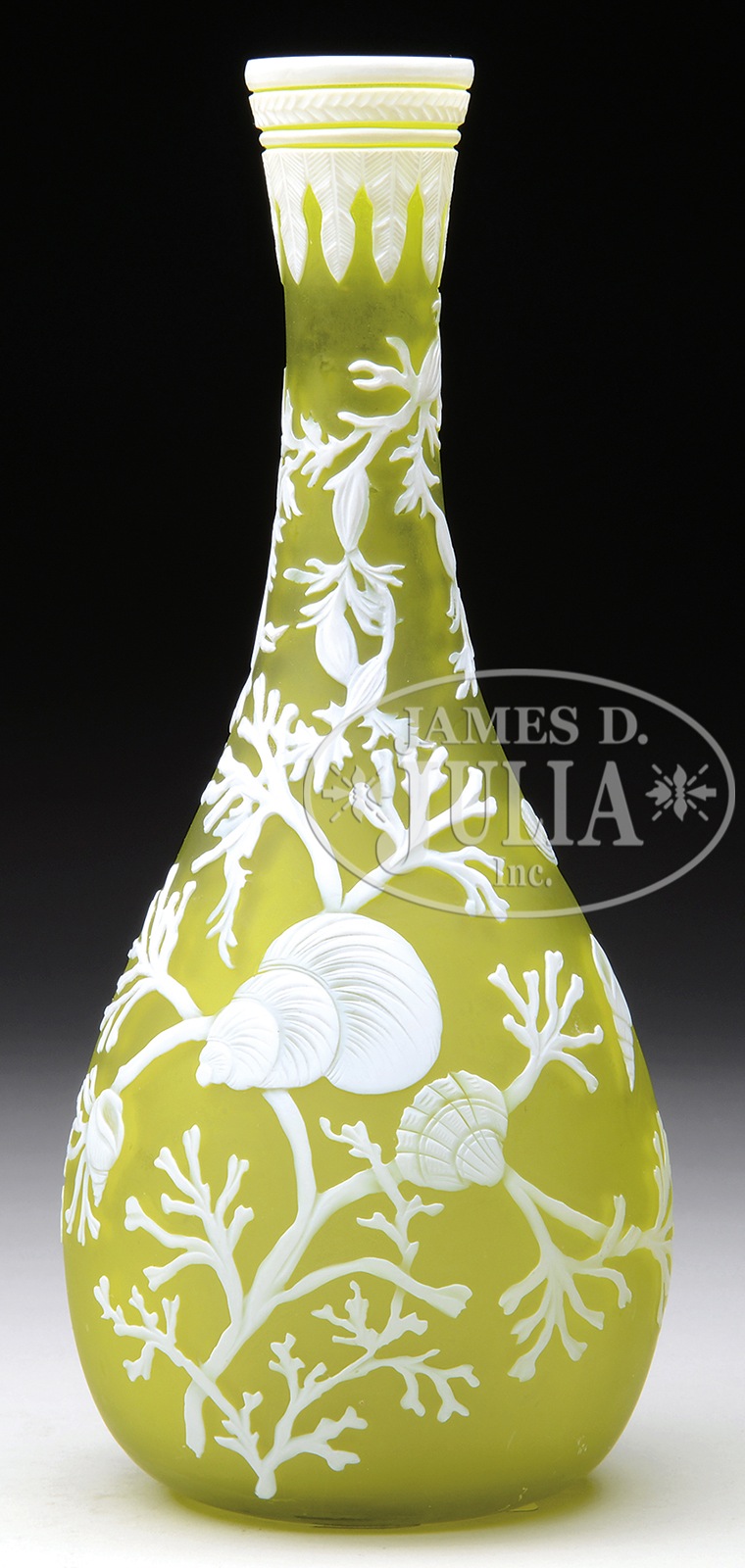 WEBB CAMEO GLASS VASE.Webb vase has white cameo decoration of seashells and coral encircling the body. Vase is further decorated with a carved white band of stylized leaves descending from the lip all set against a citrine background. Unsigned. SIZE: 9-3/4″ t. CONDITION: Very good to excellent. 48966-14 (5,000-7,000) – Lot 1411