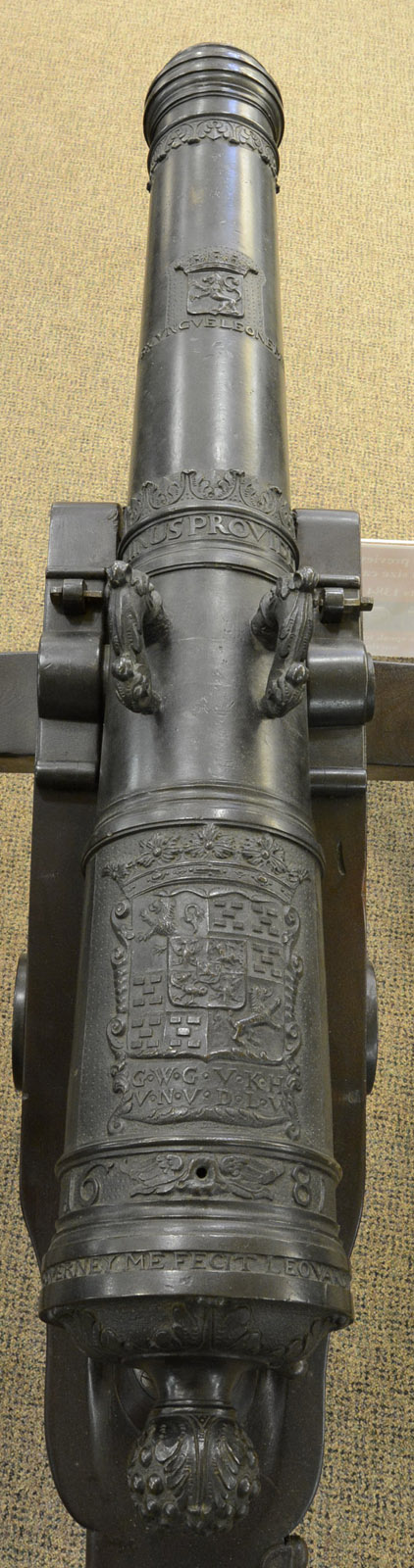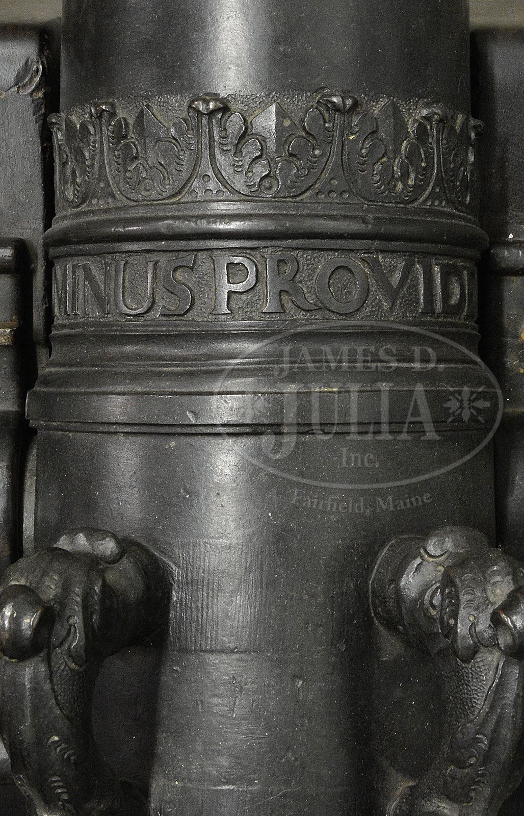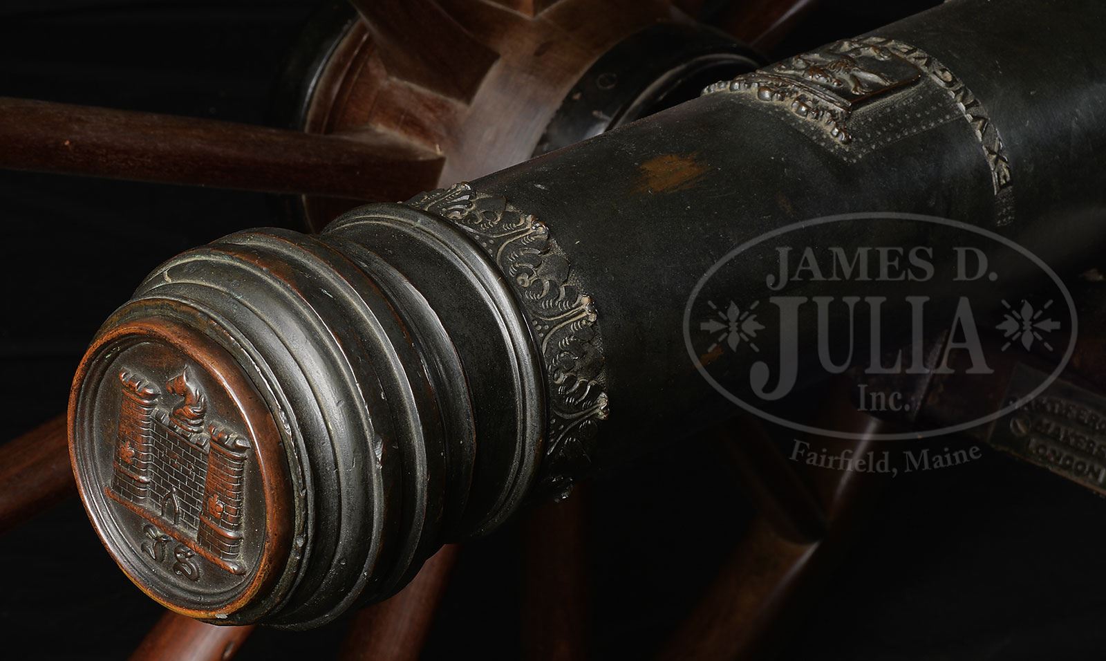 SPECTACULAR 1681 DUTCH FALCONETTE ON CARRIAGE MADE FOR COUNT G.W. VON INNHAUSEN UND KNYPHAUSEN.SN NSN. This cannon was commissioned with at least one other from Petrus Overney of Leeuwarden, Netherlands. Overney’s cannons were among the finest in the world in the 17th century. This cannon is in beautiful “as found” condition with fabulous bronze patina on bbl which appears to have never been polished or abused. There is a twin to this cannon in the Victoria & Albert Museum in London which was donated in the late 19th century. This cannon bears Count Knyphausen’s Coat of Arms, date of manufacture 1681 and rampant lion in relief with “EXUNGUELEONEM” which loosely translates to “the lion is known by its claws” or “from a sample we can judge the whole”. Wilhelm Knyphausen (1716-1800), a cousin of G.W.’s was a general in America during the Revolution. The motto “Dominus Provedebit” cast into cannon was G.W.’s personal motto – translated “God Shall Provide”. This same motto is found on his crypt where entombed at the chapel at Nienoord when he died September 5, 1709. When Knyphausen commanding Hessian troops captured Ft Washington on Manhattan Island in 1776 it was renamed Ft. Knyphausen which is across the river from Ft. Lee, NJ. The modern day location of Ft. Knyphausen is marked by Bennett Park on Ft. Washington Ave, between West 183rd and West 185th Streets in the Washington Heights Section of New York City. The park is a few blocks north of the George Washington Bridge. Long after Knyphausen’s death the two cannon were acquired by Joseph Somes, a director of the Honorable East India Company. He had carriages built for them by C.A. & T. Ferguson of London. He also had an elegant brass capped tompion made with his Coat of Arms which is still present. The Somes Family donated one of the two cannon to The Victoria and Albert Museum where it remains today. Rarely seen in institutional collections and museums is such a beautiful cannon and carriage of such quality. A large folio of information written in Dutch concerning the founder and the Knyphausen Family genealogy and concerning their various castles in Europe is included. PROVENANCE: Von Innhausen Und Knyphansen Family, Leeuwarden, Netherlands. Somes Family, England. Frank E. Bivens, Jr. Collection. Springfield Arsenal, LLC Artillery Collection. CONDITION: Fine to excellent overall. Surfaces on bbl have rich bronze patina with a few small dents to be expected after 300 years. Markings are all crisp and easily discerned as can be seen in photos. 4-54101 JS136 (75,000-125,000) – Lot 1412 Click here to view provenance