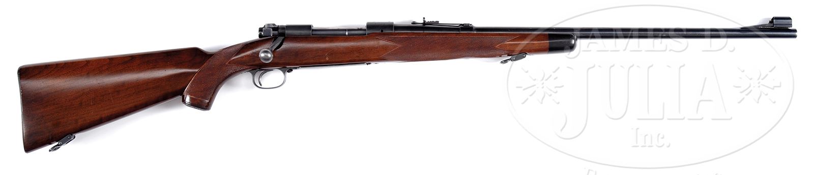 *WINCHESTER MODEL 70 SUPER GRADE BOLT ACTION RIFLE. PRE-64.SN 73613. Cal. 22 Hornet, 24″ bbl, blue finish, standard sights, checkered pistol grip stock with cheekpiece, ebony forend cap, steel buttplate, and Winchester quick-detach sling swivels. CONDITION: Fine. Bbl retains a generous amount of bright blue finish with slight muzzle wear and a few mars and scratches. Sights are good. Bore is bright with strong rifling. Receiver shows considerable matte blue finish with high point wear and a few scratches. SN’d bolt shows gray-brown patina on bolt handle. Bottom metal retains a generous amount of bright blue finish with some scratching and some plumming of finish; also some high point wear. Stock is very good with some slight handling marks. Checkering is sharp. Pistol grip cap is very good. Forend cap shows some scratching. Sling swivels are very good. Buttplate shows considerable blue with some high point wear. A very nice Super Grade M 70 in a very desirable caliber. 49473-7 TEP C&R (1,750-2,750) – Lot 1412