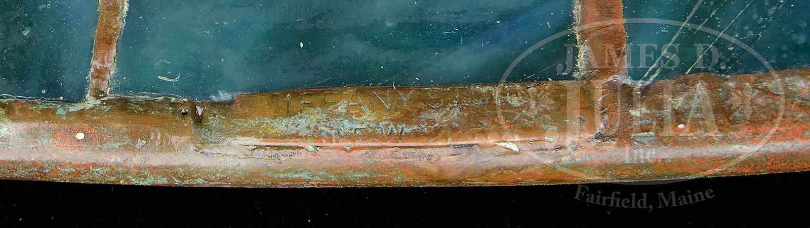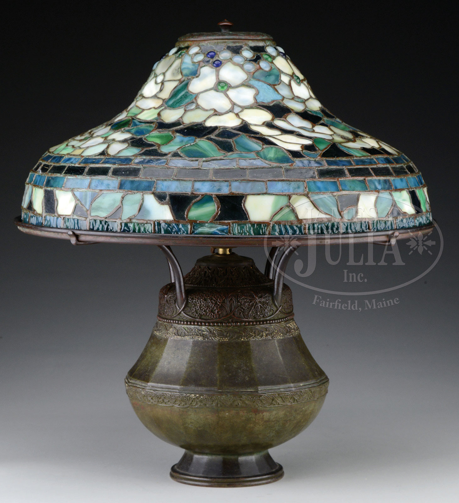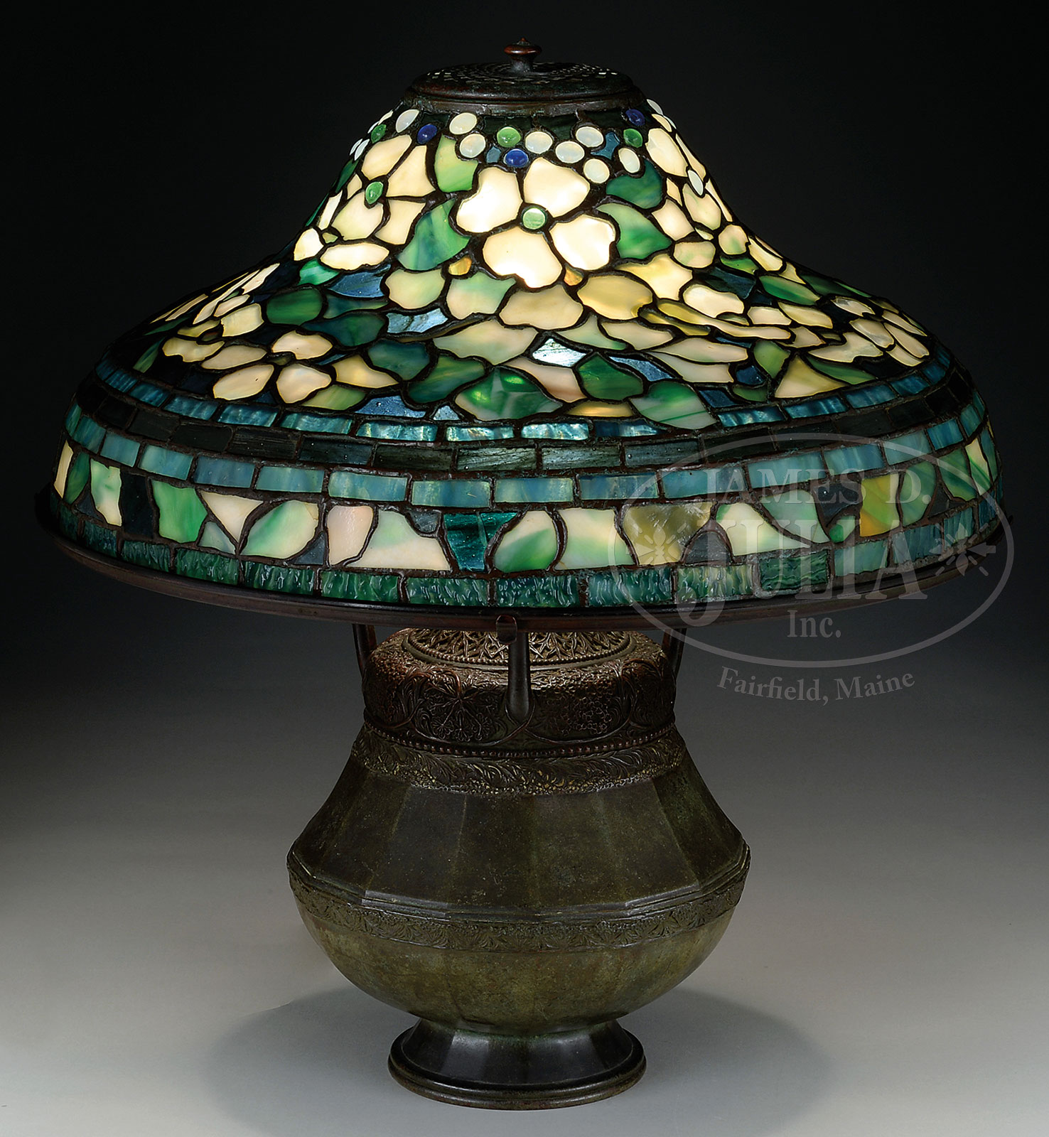 TIFFANY STUDIOS JEWELED DOGWOOD SHADE ON QUEEN ANNE’S LACE BASE.Leaded glass shade is done in the rare jeweled dogwood pattern with mottled white dogwood flowers, some of which have green and white cabochon jewels in the center. The dogwood flowers are surrounded by striated green and blue leaves, all against a striated blue and brown background. The shade is further decorated with blue, green, white and opalescent jewels around the aperture. Shade signed with small applied tag on lower rim “Tiffany Studios New York”. Shade rests on a scarce Tiffany Studios cast bronze base with ribbed sides and Queen Anne’s lace pattern adorning the waist as well as the top of the font. Base is complete with a four arm spider supporting the shade ring. Base is finished with a brown patina and green highlights, while the top of the font is finished with a reddish brown patina, complete with Tiffany heat cap. Signed on underside of font with applied round tag “Tiffany Studios New York 27476”, along with the Tiffany Glass and Decorating Co. logo, base is also signed on the underside “Tiffany Studios New York 27476″ along with the Tiffany Glass and Decorating Co. logo. SIZE: Shade 16″ dia. Lamp 18-1/2” t. CONDITION: Shade is very good to excellent with some tight hairlines and no missing glass. Base is very good, converted to electric without drilling the font, some minor wear and discoloration to patina. 51088-31 (25,000-35,000) – Lot 1412