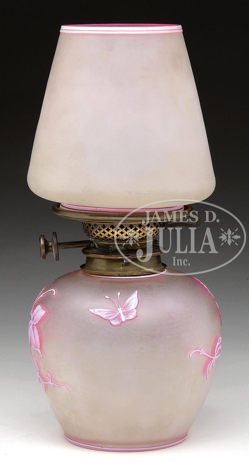 WEBB CAMEO LAMP.Webb lamp has white cut to red cameo flowers, stems and leaves surrounding the base all set against a frosted glass background. Backside of the base is decorated with a cameo butterfly. Lamp is complete with a Webb cameo shade with white cut to red flowers, stems and leaves decorating the front side of the shade. Lamp base is marked on the underside “Thomas Webb & Sons Cameo”. SIZE: 13-1/4″ t. CONDITION: Base and shade have slightly different flowers and leaves and the background on the shade is slightly lighter then that on the base. Burner is a replacement and not the proper type for this lamp. Glass on both shade and base is very good to excellent. 48388-1 (4,000-6,000) – Lot 1413