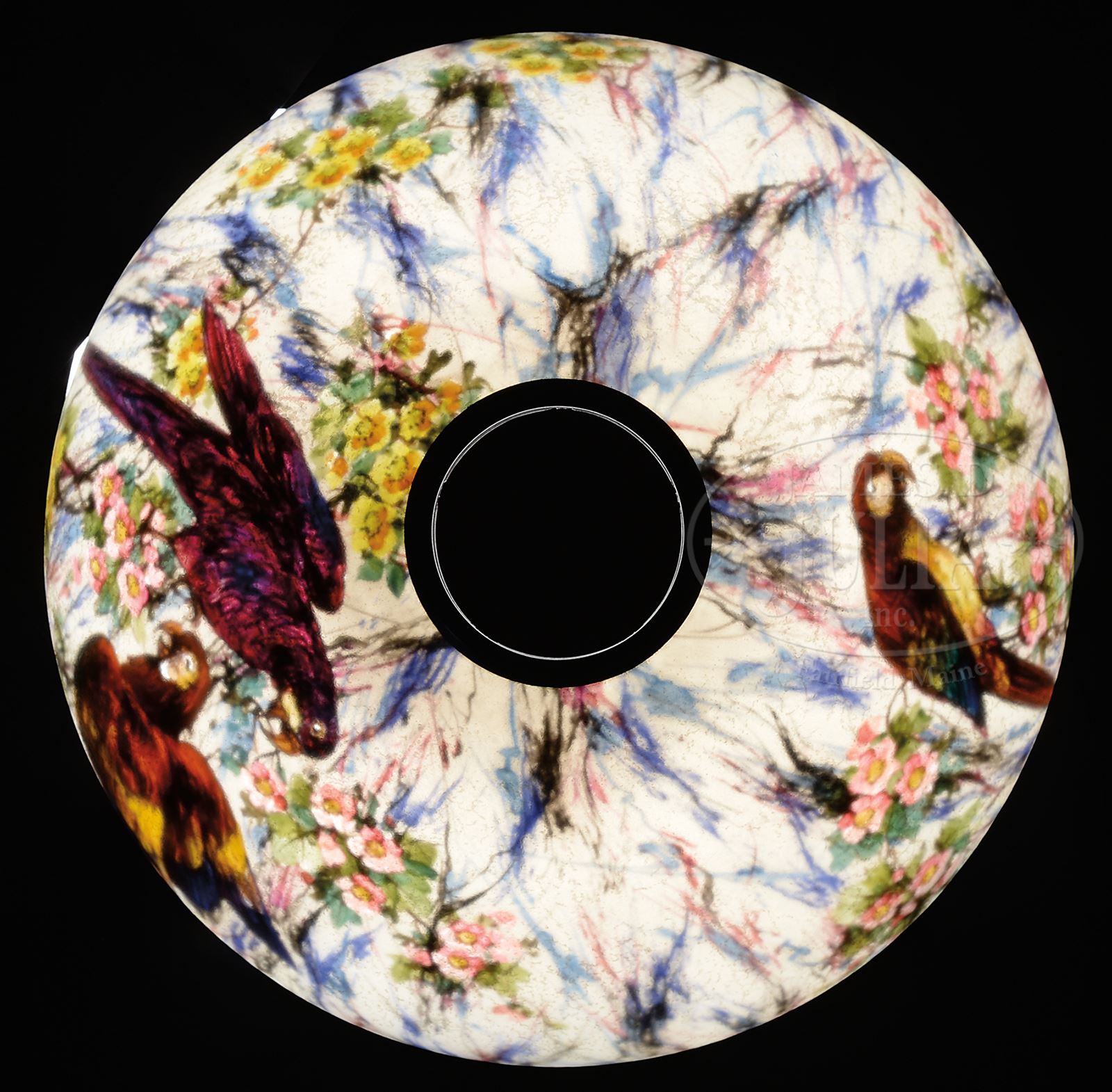 HANDEL JUNGLE BIRD TABLE LAMP.Handel table lamp is reverse painted with brightly colored jungle birds in orange, yellow, blue and black plumage. Two birds on the front of shade, single bird on back with pink, maroon, yellow and orange flowers with shaded green leaves surrounding the birds all against a cream colored background. with splashes of maroon and blue. Shade is signed on the inside rim “Handel 7128” and also artist signed “Bedigie”. Shade rests on a Handel base with round platform and stylized leaf decoration around the edge. Platform supports three legs leading to an urn shaped center with simple riser leading to a three socket cluster and fleur-de-lis cap. Base is further decorated with three amber glass flowers just below the urn, finished dark brown. Unsigned. SIZE: Shade 17-3/4″ dia. Lamp 23″ t. CONDITION: Shade is very good to excellent. Base is very good to excellent with only minor wear to finish. Re-wired with contemporary plastic cord. 49566-4 (8,000-12,000) – Lot 1413