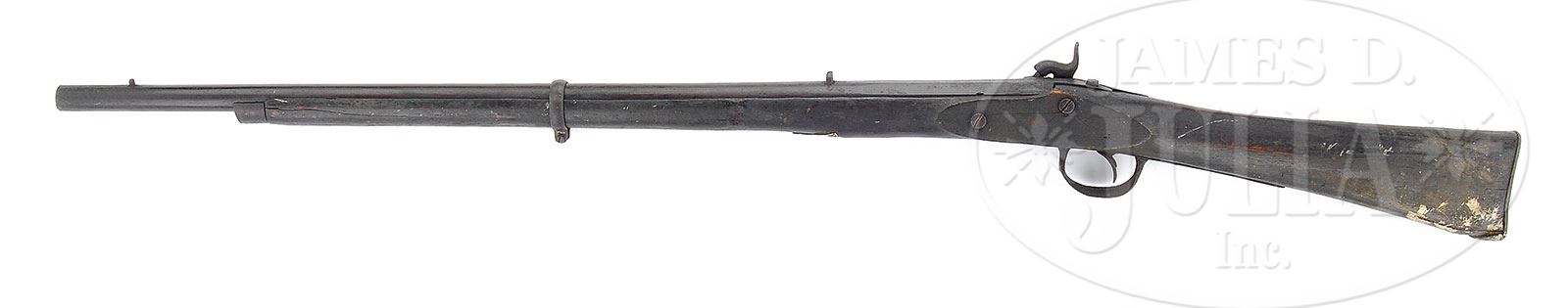 CONFEDERATE ARKADELPHIA RIFLE.SN 5. Cal 577. 32-1/2″ bbl. This is without doubt the rarest Confederate production longarm to ever be sold. This is the only complete specimen of this gun known. We have been able to find a lockplate SN 8 in an Arkansas Museum mounted in a sporting rifle. An excavated lock is also known. John Murphy and Howard Madaus in their definitive text on Confederate longarms, Confederate Rifles and Muskets, state “Rifles were made in Arkadelphia, Arkansas for a short time, and then the equipment and workers moved to Tyler, Texas where the rare Tyler (Texas) ordinance works rifles were produced.” Murphy & Madaus did not know of this recent “find”. From the Spring 2003 Texas Gun Collector Magazine article which chronicles the “finding” of this rarity by Rick Steed and Jamie Deason: “The rifle is 47-3/4 inches overall with a barrel length of 32-1/2 inches, the first six inches, at the breech, are hex shaped. The sights contist of a simple V notch at the rear located seven inches forward of the tang, and a very simple wedge shaped blade .577 caliber with three lands and grooves. The lock is marked CS 1863/ARKADELPHIA,ARK (as seen in photo); the percussion hammer stamped 5 on the right side, and is affixed by two bolts that screw into the plate. To prevent the lock bolts from compressing the left side of the stock, each has an iron washer, with a single “wing” on the left side, between the bolt head and the stock. The barrel is secured in its channel by a crudely made “Enfield style” iron band that is marked 5 on top and a tang, which along with its screw, is also marked 6. The barrel is marked 5 on the top barrel flat. I suppose this, then, must be rifle serial No. 5. With the exception of one small brass plate at the base of the ramrod channel, all furniture is iron and crudely manufactured. There is no provision for a sling but the trigger guard has one hole (not visible in photograph) that could have supported a swivel. The nose cap is sheet iron. Possibly the strangest component of the rifle is the stock, which has no comb at all. It is very crude and shows several cracks and checks that seem to indicate the wood was not properly cured, probably the result of hurried manufacturing. A local collector has a copy of the record book from the arsenal that lists all workers including three slaves listed as carpenters; perhaps these men carved the stocks for the arsenal. Despite the overall crudeness of the stock it shoulders very well. There are two period repairs to the stock in front and behind the lock on the right side. In both cases small chips broke off and were reattached with small square nails. The history of arms production in Arkadelphia is one of necessity. After initial military setbacks in the Trans-Mississippi, most Arkansas Confederate troops and arms were sent east of the Mississippi. This move forced Trans-Mississippi Confederate authorities to operate almost entirely independently of Richmond. In an attempt to arm and equip an army, weapons, cartridges, percussion caps etc were manufactured in Arkadelphia Arkansas. Production figures and other records are not known at this time, so the exact number of weapons produced is not available. Although very little information exists regarding rifles produced in Arkadelphia, we do know that the advance of Federal forces to Little Rock Arkansas forced authorities to move machinery and personnel to Marshall and Tyler Texas. The records of the Tyler Ordnance Works are more complete and these show that the Tyler works repaired a number of Arkadelphia Rifles. These records help establish the connections between the Arkansas operations and those in Marshall and Tyler Texas.” For the person who wants the single rarest Confederate longarm ever sold, they will have to buy this one because another one is likely never to turn up. CONDITION: This gun is in “as found” condition. Metal is dark and brown/black. Markings are discernible and easy to read on lock, as are scattered serial numbers on other parts. Stock is sound, dark with scattered cracks, scratches, paint splatters. Trigger guard is missing one screw. Stock is missing one band. A brass ramrod pipe has been added to back of ramrod channel for probable continued use after the war. A 5″ x 1/4″ sliver of wood is missing from forestock from bolster forward. 8-76244 (45,000-55,000) – Lot 1414a Click here to view provenance