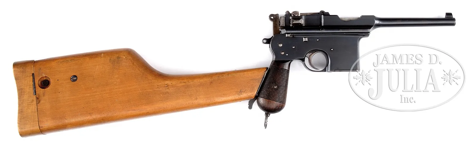 *EARLY ASTRA M900, SINGLE LINE ADDRESS, SMALL RING HAMMER WITH STOCK.SN 2437. Cal. 7.63MM. Standard configuration Astra M900 with 5.5″ bbl having fixed front sight and slip-in rear sight marked 50-1000. Short extractor, 2-lug firing pin and small ring hammer. Sideplate with the early single line address. Serial number “2437” on frame just above the left grip. The right side of bbl, bbl extension and frame marked with the early automatic pistol proof. Accompanied by the Eibar mark & “P.V.” on the frame. Full size walnut grips with fine serrations. Lanyard ring present. Major components rust blued. Most minor parts fire blued. Disassembly shows all matching numbers including each of the grip panels. Accompanied by an unmarked Mauser early Post-war shoulder stock, hinge without loop, with a repaired hairline 2.5″ crack along the top spine, stamped with a matching “2437” inside the lid. Modified lug is a forced match to the gun with a replacement plunger. CONDITION: At least 90-95% orig rust blue with expected wear on each side of the rail and freckling on the grip straps. Commensurate fading on the fire blued parts and oil darkening of the grips that have a scattering of dings and minor losses. Bright bore with slightly shallow rifling. Perfect manual mechanics. Very good Mauser stock with added numbers and lug modification. As most early Astra M900s saw hard use in Asia, this is one of the better examples to be offered at auction. 51010-2 (3,000-4,000) C&R – Lot 1417