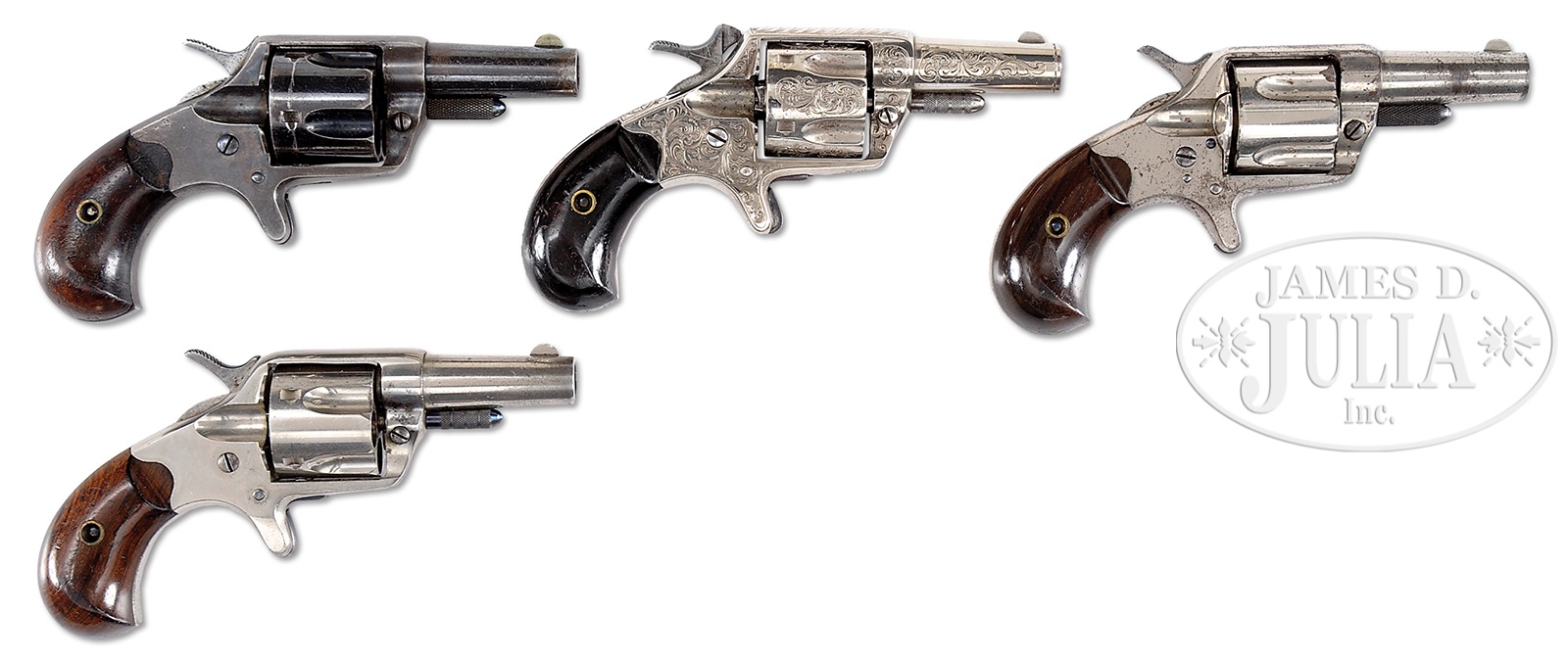 LOT OF FOUR COLT NEW LINES.SN 2914. 1) Cal. 41 RF. SN 2914. 2-1/4″ bbl, 5-show cylinder. Blade front sight with frame notch rear sight. Rosewood grips, etched panel “Colt New .41. Jackson Arms Sales Receipt included. 2) Cal. .41 RF. SN 2167. 2-1/4″ bbl, 2-line bbl address, blade front sight and frame notch rear sight, 5-shot cylinder, rosewood grips, factory engraved. Jackson Arms sales receipt from 1976 included. 3) Cal. .41 CF. SN 6663. 2-1/4” bbl, 5-show cylinder, rosewood grips, “Colt New .41″ etched panel. Collector’s notes included. 4) Cal. .41 CF. SN 1952. 2-1/4” bbl. Blade front sight, frame notched rear sight, 5-shot cylinder, etched panel “Colt New .41”, 2-pc rosewood grips. PROVENANCE: The Dr. Robert G. Cox Estate Collection. CONDITION: 1) 50% orig blue with areas of flaking and a noticeable cylinder drag line. Grips have orig finish with normal dents and scratches. 2) 80% bright nickel with light flaking. Grips have darkened with age and are in very good condition. Bore is very good. 3) 40% orig nickel finish with sharp edge wear and flaking. Grips have orig finish in very good condition. Bore is good. 4) Metal has 60% bright orig nickel with flaking on left side. Hammer, trigger and cylinder pin have bright fire blue. Grips have orig finish with light scratches and dents. 50019-113, 50019-115, 50019-308, 50019-310., TN13 (3,000-5,000) – Lot 1418 Click here to view provenance