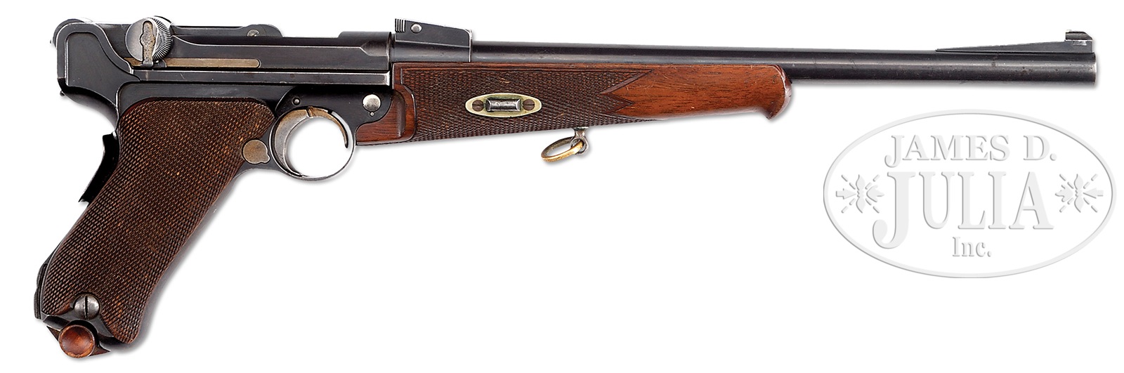 *SCARCE DWM MODEL 1902 LUGER CARBINE.SN 21641. Cal. 7.65 Luger. 11-3/4″ bbl. 1 of approximately 2500 produced, Luger Carbines have always been intriguing. Slide adjustable bbl mounted sight, graduated from 100 to 300 meters. Blue finish with straw trigger, ejector, extractor and takedown latch. 1902 model with grip safety and accompanied with period spare mag. Has lug for detachable shoulder stock. CONDITION: Very good overall, as presented with the exception of missing trigger sideplate, all other mechanics are fine as presented. Fair percentage of straw remains as does most all orig rust blue finish overall. Front strap finish has evident wear and has turned plum. Checkered walnut commercial grips and forearm are very fine with only slight wear to grip handles, no wood loss or damage. Both wood based mags are excellent with no chipping or wood loss on bases. 50944-1 TDW (4,000-6,000) C&R – Lot 1418