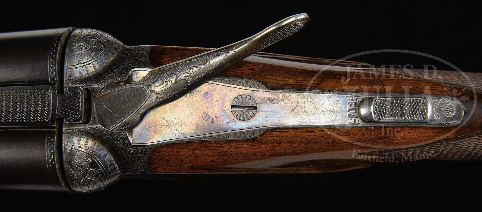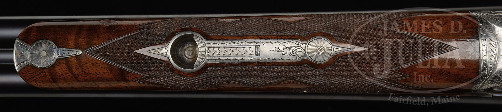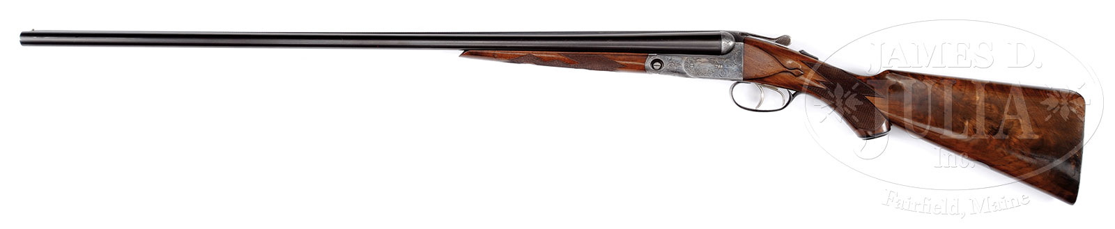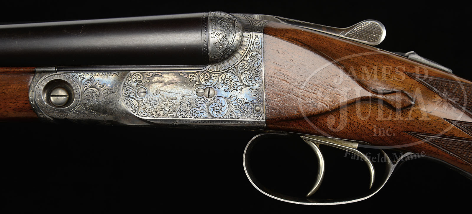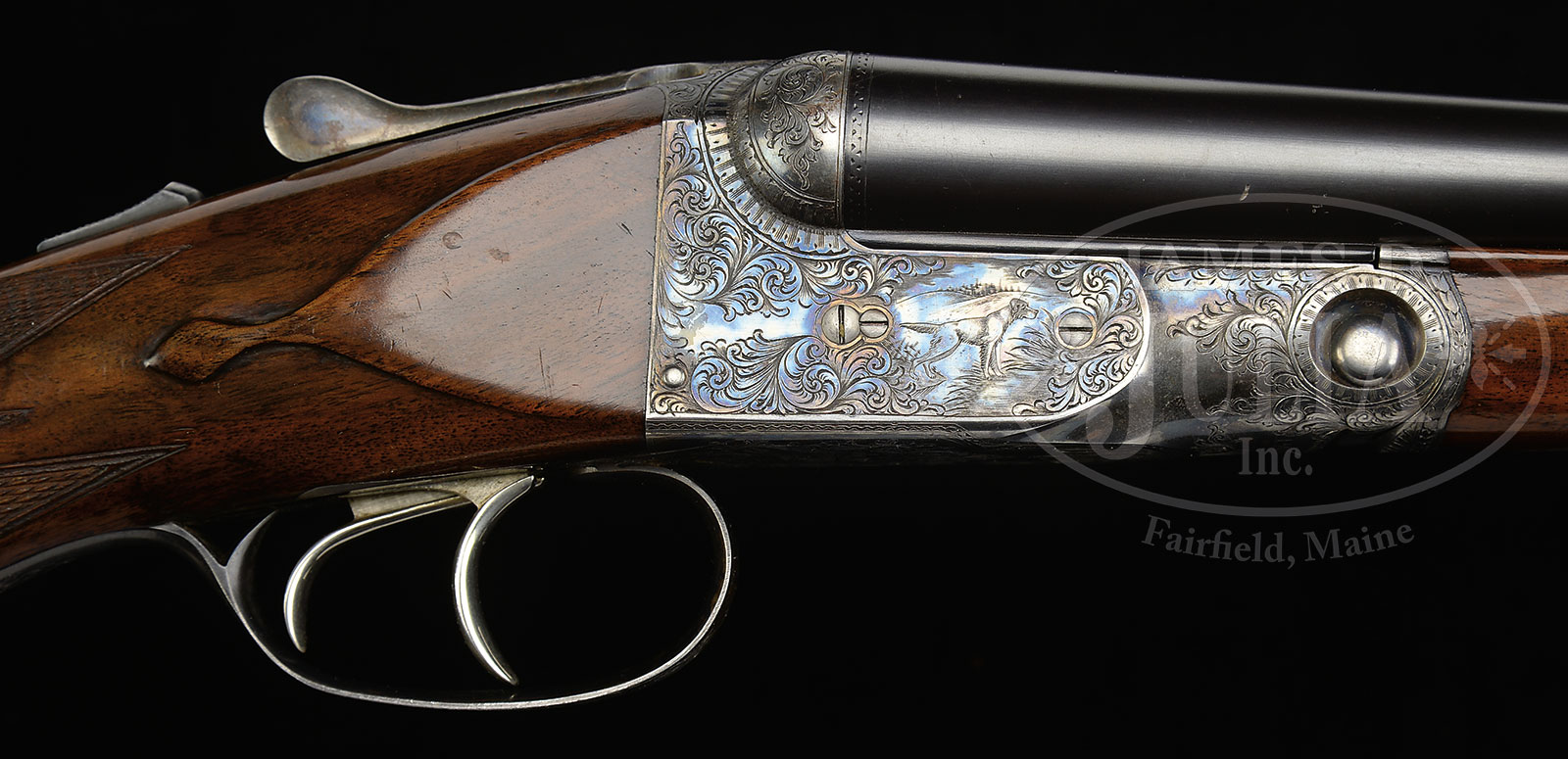 *FINE PARKER “DHE” SHOTGUN WITH UNUSUAL TRANSITIONAL RIB MARKINGS.SN 241016. Cal. 20 ga. 2-3/4″ Chambers. 0 Frame. 30″ Bbls are marked “PARKER MERIDEN. CON. U.S.A.” on matted rib. Steel type is not specified on rib or on bbl flats, which are stamped with Ilion date code “DF” (Sept ’37), and repair code “PG” (June ’38). All other marks are correct. Case hardened action with all correct Parker markings on water table, features automatic safety and dbl triggers. It is engraved in late “D” style with 80% coverage varying sized scroll surrounding vignettes of dogs and game; pointer on left, setter on right, and quail on the trigger plate. “PARKER” is engraved on bottom of action. Trigger guard with scroll on bow, has SN on tang. Fine crotch figured American walnut Parker Meriden capped pistol grip buttstock measures 14″ over skeleton steel buttplate. Stock has usual “D” style side panels with lozenge shaped drop points, and point pattern checkering. A vacant silver oval is on toe line. Typical splinter ejector forend has steel tip and usual release. This gun matches all specifications as listed in the PARKER GUN IDENTIFICATION & SERIALIZATION ledger. Bore diameter: left -.619, right – .617. Bore restrictions: left – .024 (full), right – .023 (full). Wall thickness: left – .022, right – .022. Drop at heel: 2-1/2″, drop at comb: 1-5/8″. Cast: Neutral. Weight: 6 lbs. 12 oz. LOP: 14″. PROVENANCE: Ex William Larkin Moore Collection. CONDITION: Excellent, original. Bbls retain approx 90% of what appears to be orig blue, as may have been applied at repair date, sides somewhat spotted, and with a few marks. Action retains approx 70% orig case hardening color, quite vivid on right side and trigger plate, silvered on fences and beads, and thinning on bottom. Blue of trigger guard mostly flaked to about 10%, silvered at grip. Color on forend latch completely silver. Plating on triggers is excellent. Stocks retain over 90% of their wonderful orig finish, slightly alligatored and crazed on butt, worn through on sharp edges of comb. Checkering is very lightly worn, still relatively light in color. There is a small repaired crack running from trigger guard screw back into checkering on left side. Bores are excellent. Action is tight. Ejectors are in time. A fine little long barreled small bore DHE, with only about 330 estimated made in this caliber, gauge, and bbl length. 51497-3 MGM145 (10,000-15,000) C&R – Lot 1418