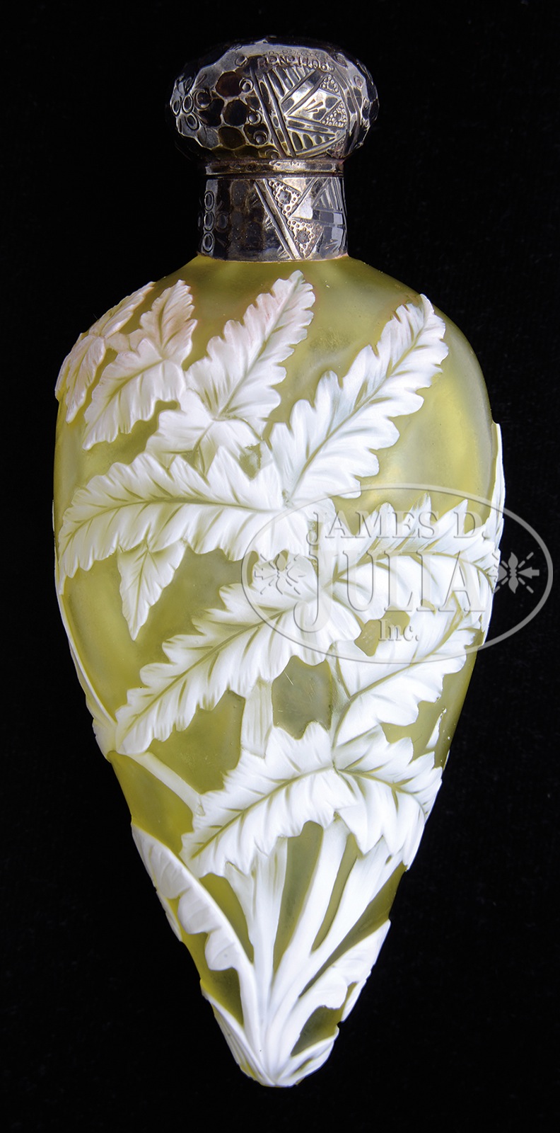 WEBB CAMEO GLASS LAY DOWN PERFUME.Webb lay down perfume has white cameo glass stems and leaves on the front and two wheat stalks on the back all set against a yellow glass background. Scent bottle is finished with a hammered sterling silver hinged lid with the profile of a woman’s head on the top. Bottle is complete with its interior glass stopper. Unsigned. SIZE: 4″ long. CONDITION: Interior glass stopper has been ground into a cone shape so it wobbles when in place, otherwise very good to excellent. 48966-38 (1,200-1,500) – Lot 1420