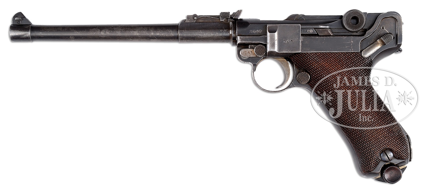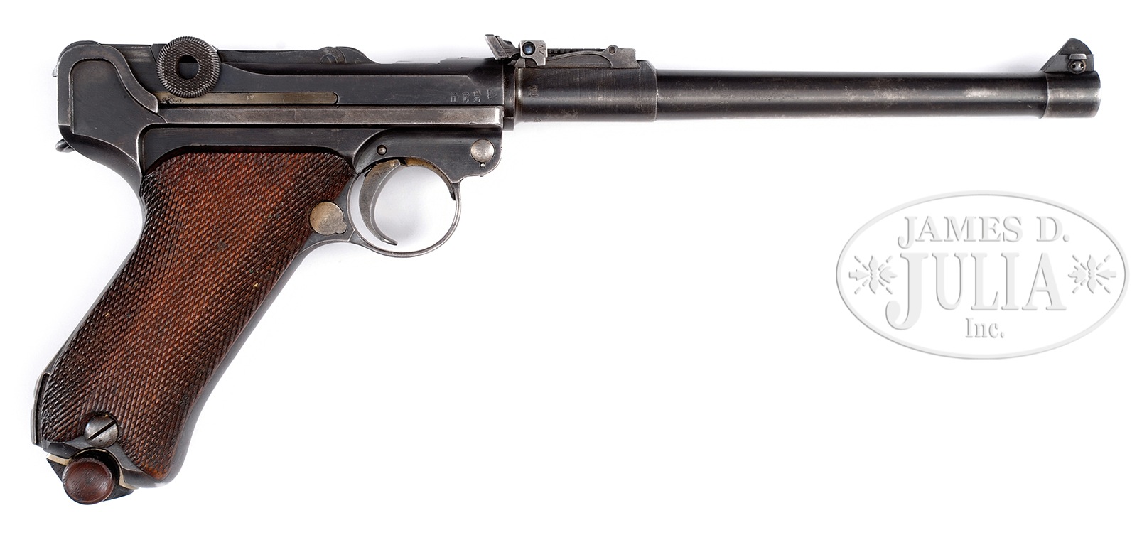*◊ VERY FINE PATTERN 1914 ARTILLERY LUGER.SN 2647. Cal. 9mm. Rust blue finish overall with 9-position adjustable rear sight with fine tuning adjustment on rear blade. 8″ bbl with “1914” chamber date and toggle marked “ERFURT”. 2-pc checkered walnut grips with wooden base Imperial marked magazine. PROVENANCE: The Friedrich-Wilhelm Dauphin Collection, Germany. CONDITION: Very fine overall, with all numbers matching with exception of magazine. Good mechanics with strong bore. Much period rust blue finish remains with typical thinning on bbl and grip straps. Checkered walnut grips are quite fine with minor wear but no cracks, chips or material loss whatsoever. A good percentage of straw finish remains on levers, trigger and ejector. Imperial proofs are found throughout. An overall nice example. 49829-48 TDW (2,000-3,500) C&R – Lot 1421