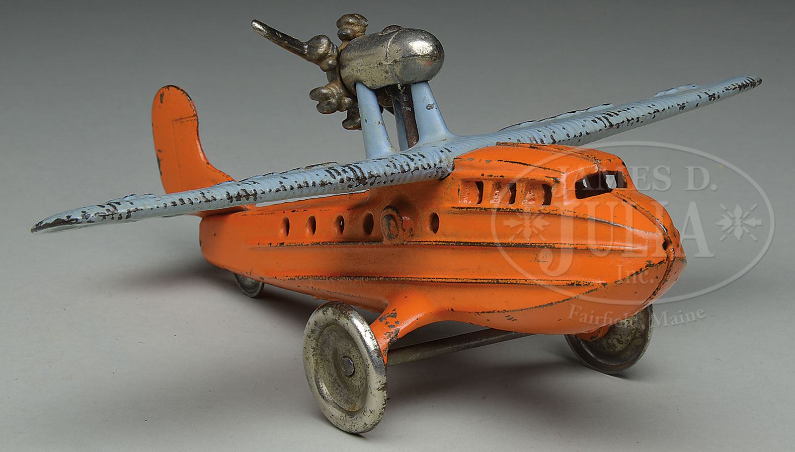 “KILLGORE SEAGULL” CAST IRON AIRPLANE.A great, most realistic airplane manufactured by the Killgore Company of Ohio. The company had wonderful detailing with the simulated ribbing to the cabin area, simulated passengers within the windows and the wing itself being partially flat and ribbed embossed “Seagull” and even adding a seagull in flight on the left & right wing tips. This particular airplane appears to have been modeled after a Vickers Submarine Seagull Navy Plane of the 1930s vintage. Obviously the toy manufacturer took a little artistic license and eliminated the second upper wing, most likely due to production costs. SIZE: Wingspan is approx 8-1/8″. CONDITION: Overall very good plus with some chipping mostly on corners of wing or tail fin. 1-14557 (800-1,200) – Lot 1422 Auction: Advertising, Toy & Doll Auction - Fall 2014 Please Note: All prices include the hammer price plus the buyer’s premium, which is paid by the buyer as part of the purchase price. The prices noted here after the auction are considered unofficial and do not become official until after the 46th day. |