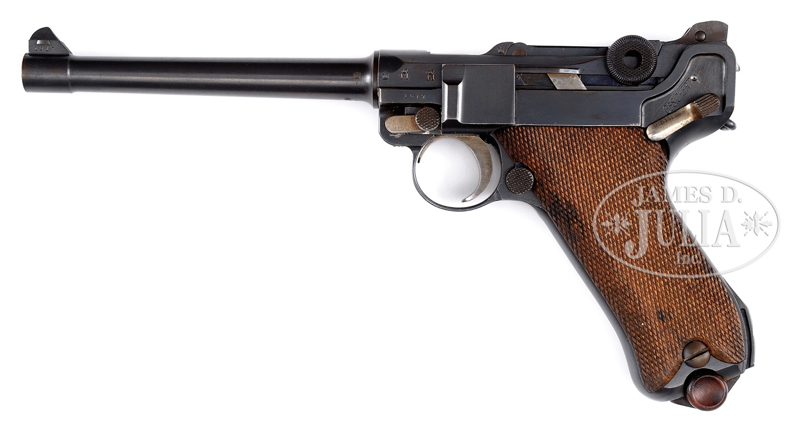 *◊ VERY FINE WORLD WAR I GERMAN DWM 1917 NAVY LUGER.SN 271A. Cal. 9mm. 6″ bbl with blue finish overall with “1917” chamber date and “DWM” in script on toggle. 2-pc walnut checkered grips. Wood base bright steel magazine. Slide adjustable 200 meter Navy rear sight at rear of toggle. Serial numbered in the A Series. Left forward portion of frame dated “1917” as is left side of front sight base. Very nice crown M Navy markings on left side of chamber. PROVENANCE: The Friedrich-Wilhelm Dauphin Collection, Germany. CONDITION: Very fine overall, with most period rust blue finish remaining. Matching numbers throughout with the exception of magazine and unnumbered grips. A large amount of straw finish remains on lever, trigger and extractor. Very good mechanics with strong bore. 49829-175 TDW (2,500-5,000) C&R – Lot 1423