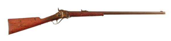 SHARPS MODEL 1874 SPORTING RIFLE. SN 162343. Cal. .40-70 Bottleneck, 30″ oct. bbl. Sights have been modified and the large buck horn added to the rear and a thin blade with bead to the front. CONDITION: Covered with dried grease mixed with surface rust but metal appears to be fairly smooth. Wood shows heavy scratches and some chipping with vice marks at the wrist. FS868 4-47469 (2,500-4,500)