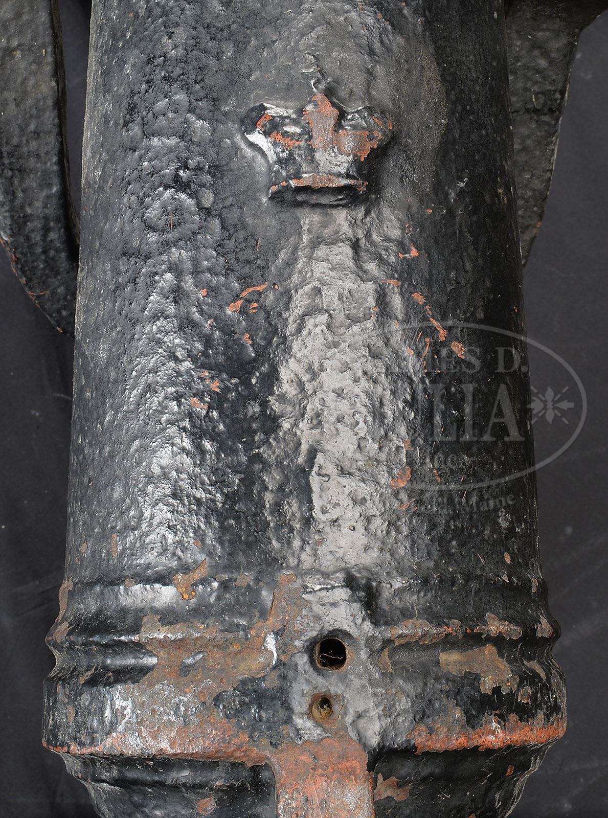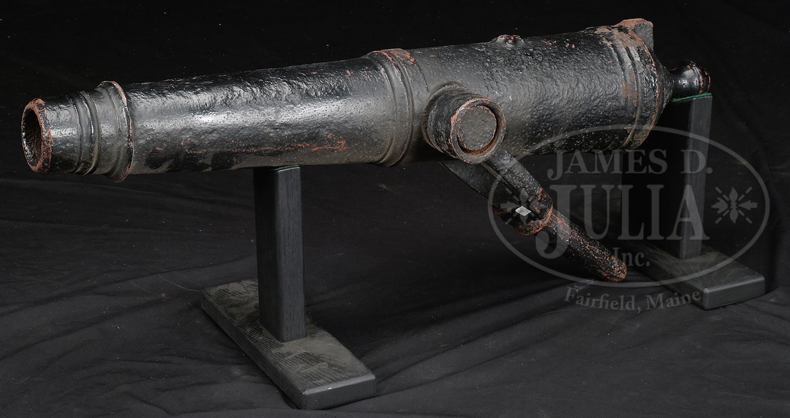 IRON ENGLISH SWIVEL GUN WITH ORIGINAL YOKE.SN NSN. This well made swivel gun with crown in relief on top of first reinforce. This banded tapered tube measures 29” and about 34-1/2” including cascabel. 10” wide at trunnions with a 15” yoke. This is a typical gun that would be found on many maritime vessels in the late 18th century and early 19th century to protect cargos against pirates or other risks. Maritime insurers of the era such as Lloyds in London required merchant vessels to be armed with such cannon. This is a fine cannon that displays well on its orig swivel yoke that is not often retained. PROVENANCE: Springfield Arsenal, LLC Artillery Collection. CONDITION: Good to very good overall with heavy pitting under black paint. Bore is clear though rusted and pitted. 4-54226 JS252 (6,000-8,000) – Lot 1424