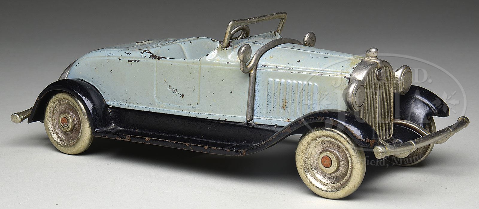 KILGORE CAST IRON LARGE STUTZ ROADSTER.Circa late ’20’s. Impressive toy with black fenders and running board. Nickel plated bumpers, grille, headlights, steering wheel and more. Body has all original light blue paint. Substantial heft and size. SIZE: 10″ l. CONDITION: Toy is all original and complete. Nickel plated areas are very good, paint is good plus with some light chipping. 1-14561 (600-1,200) – Lot 1425 Auction: Advertising, Toy & Doll Auction - Fall 2014 Please Note: All prices include the hammer price plus the buyer’s premium, which is paid by the buyer as part of the purchase price. The prices noted here after the auction are considered unofficial and do not become official until after the 46th day. |