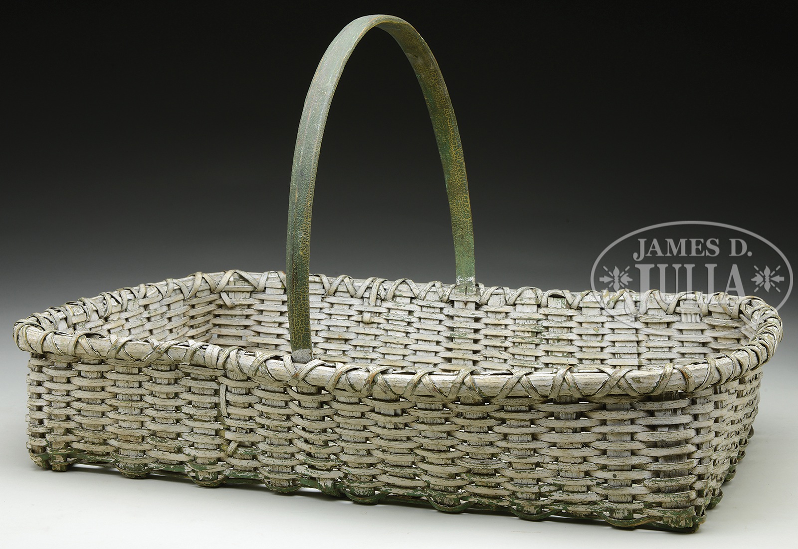 RECTANGULAR PAINTED GATHERING BASKET.Circa late 19th century, New England. Ash, old, dry, crusty paint. Shallow rectangular body with open weave bottom, double wrapped rim and tall semi-circular carved handle. The handle in original dry, crazed Windsor Green paint. The basket in dry old white paint over the original green. SIZE: 18″ x 13″ x 11″. CONDITION: Very good, untouched condition, very nice patina with age appropriate paint wear, no breaks or losses to splint. 9-96625 (500-800) – Lot 1425