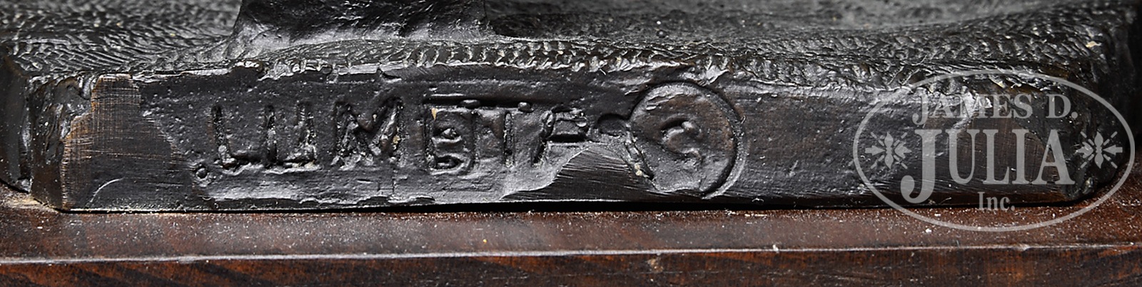 L. LUMETTA (American, 20/21st century) “HOLD THAT LINE”.Bronze Mounted to a revolving conforming wood base with name plaque Signed on edge “Lumetta” SIZE: Bronze: 15-1/2″ x 15″ w. With base: 17″ h CONDITION: Very good. 49384-2 (1,500-2,500) – Lot 1425