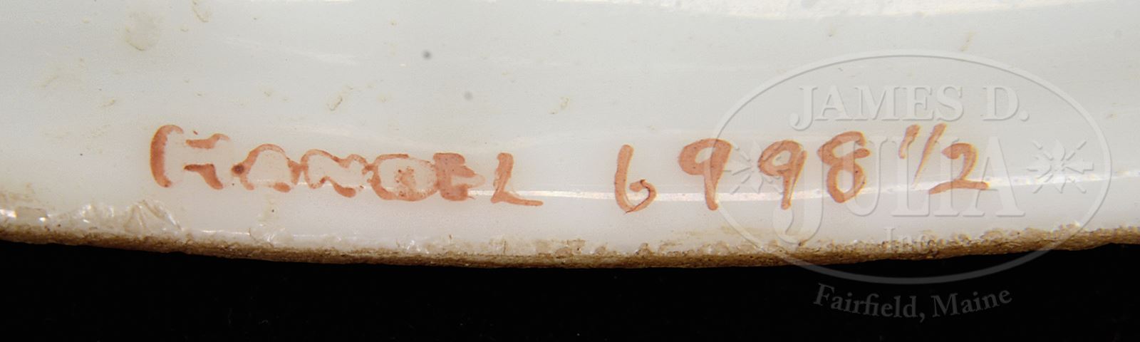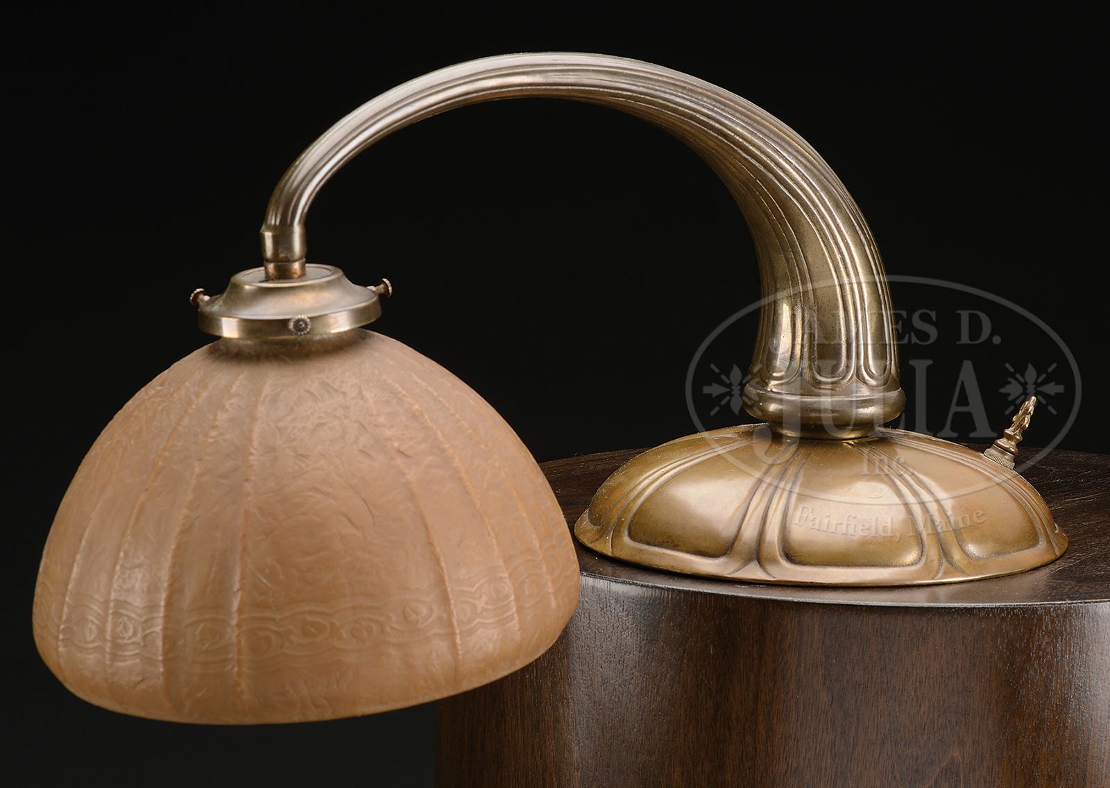 HANDEL MOSSERINE PIANO LAMP.Handel piano lamp has stamped brass round foot with arching ribbed arm leading to single socket and shade holder. Round base has light brown patina while arm and shade holder have silvered patina. The base houses a brown Mosserine shade with vertically ribbed body, chipped ice finish and a delicate acid cut band of leaves and vine. Signed on the interior “Handel 6998 1/2”. Base unsigned. SIZE: Shade: 7-1/4″ dia. Lamp 8″ t. CONDITION: Shade is very good to excellent. Base is very good to excellent with some wear and discoloration to patina. 50489-1 (1,750-2,250) – Lot 1425