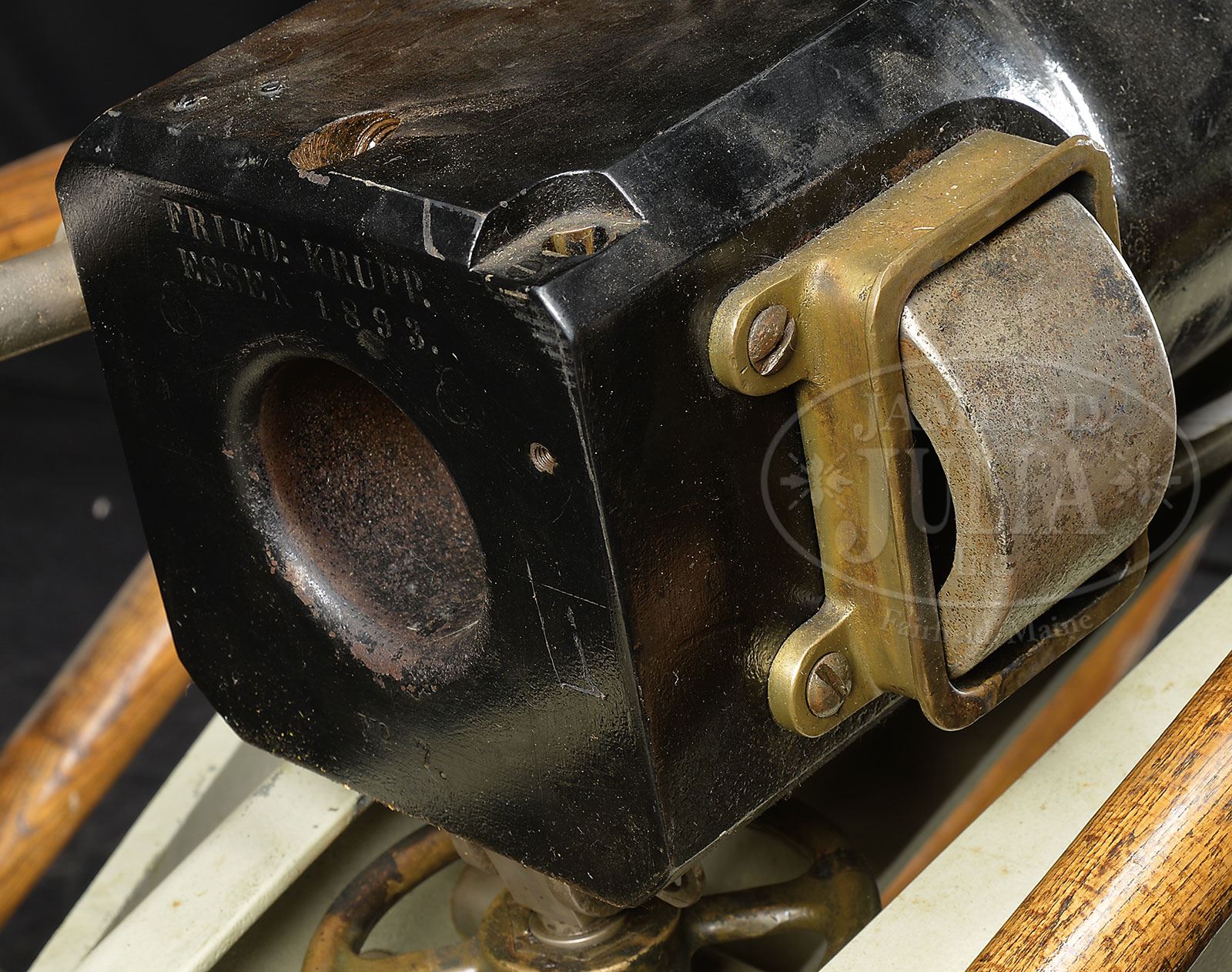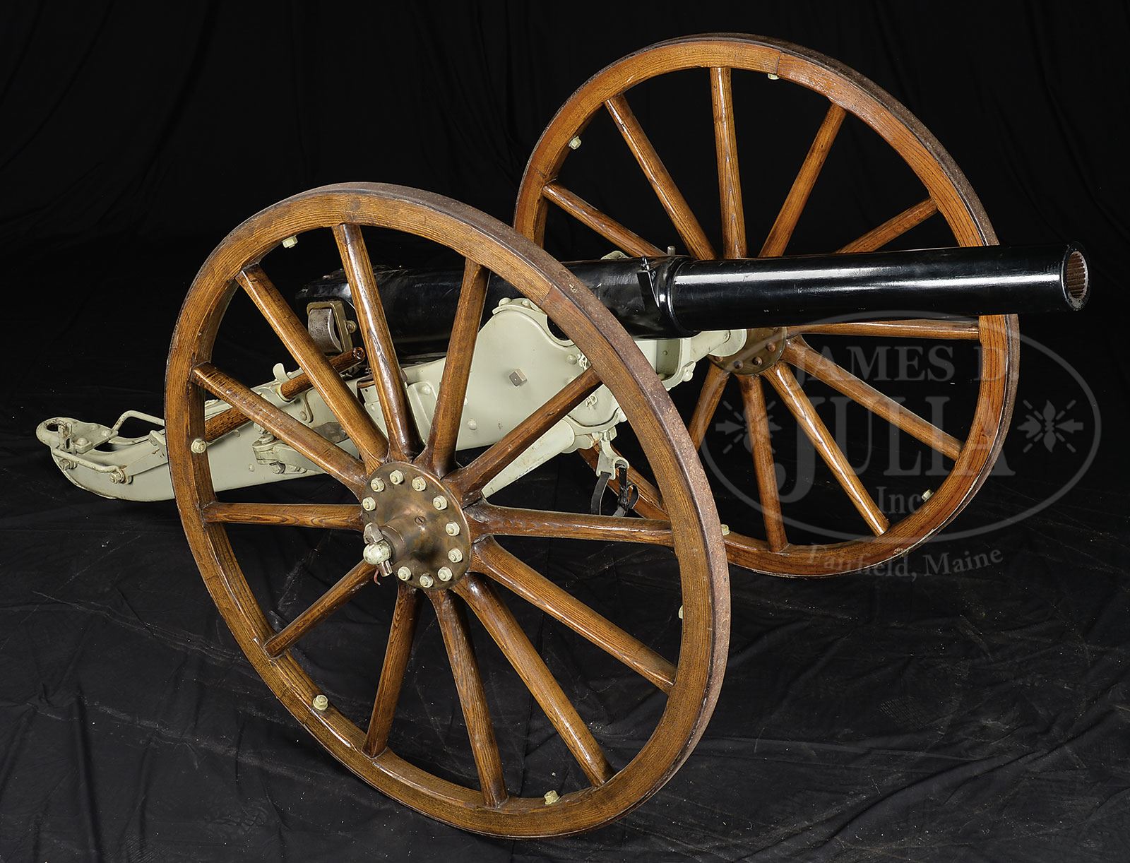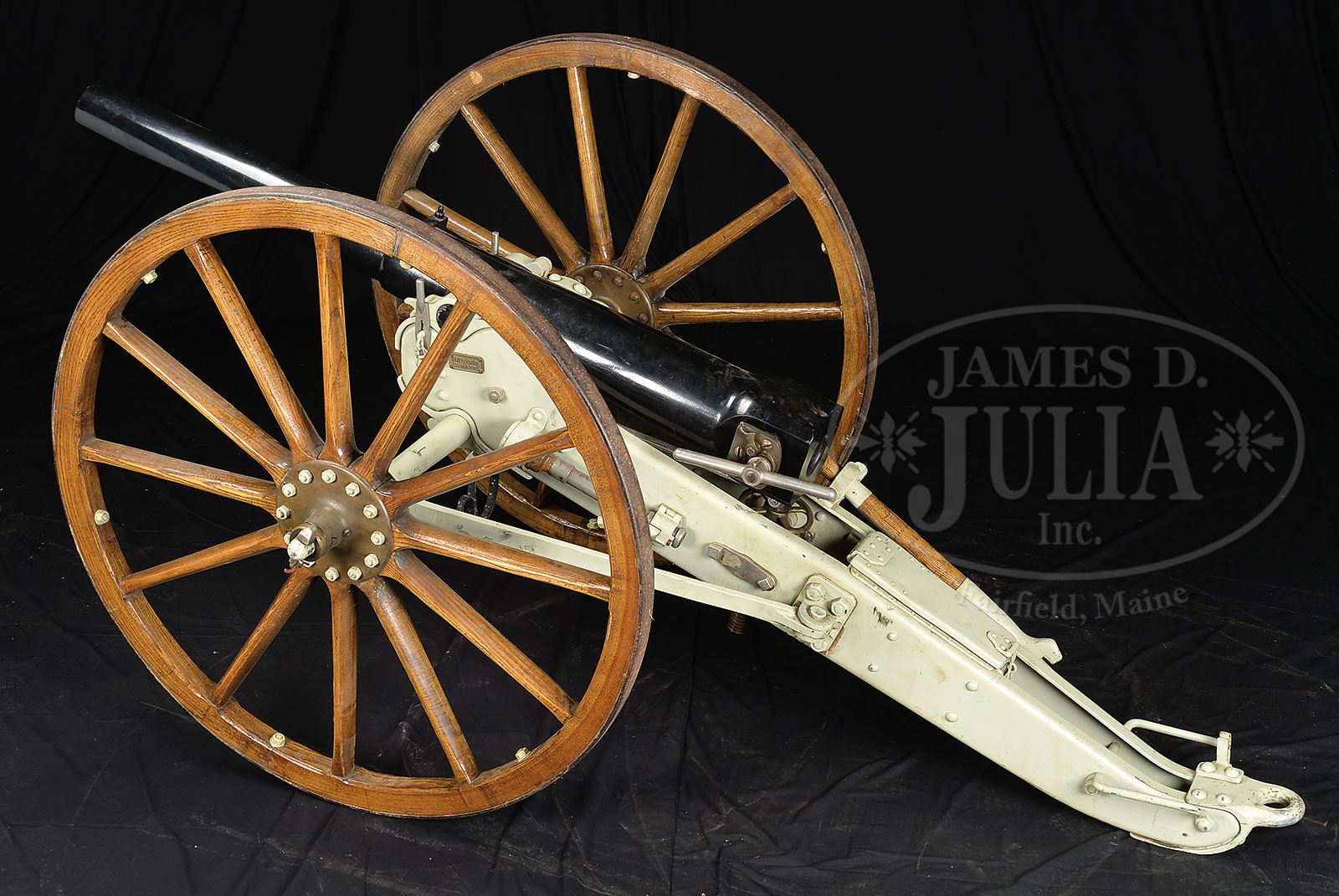 FRIEDRICH KRUPP 1893 DATED 75 MM SLIDING BREECH BLOCK MOUNTAIN GUN ON FIELD CARRIAGE.SN 7. This well conditioned gun is complete with breech marked, “FRIED.KRUPP/ESSEN 1893”. Right trunnion marked “331kg” which translates to about 728 lbs. Carriage has makers plaque on left side and “NO.7”. 71” from breech to muzzle. This cannon has a sliding breech block which locks into place with a large rotating hand crank shaft much the same way that someone would wind their watch. Once in place a steel plug articulates into a socket which holds the breech in place. This appears fully functional. Front sight is just forward of trunnions and it’s a simple post. Rear sight is a brass post within a ring. All steel carriage with brass hubs and wooden spoke wheels, “FRIED. KRUPP/ESSEN A/R No. 7” on right side plaque. Loading accouterments present attached to carriage are the wooden trail bar, cartridge charger and cleaning brush. PROVENANCE: Springfield Arsenal, LLC Artillery Collection. CONDITION: Overall finish and appearance is very fine with over 95% black enamel paint on steel tube. Breech block is likewise is very fine condition. Chamber has fairly significant pitting and brown scale but rifling is strong and clearly defined lands, dark throughout. Carriage is also extremely fine with steel parts retaining over 90% of a pale khaki paint on steel parts, brass remaining unpainted turned to a dark patina. Nuts display evidence of having been removed from the bolts on the hubs. Wooden hardware of wheels also in extremely fine condition retains over 95% of a varnished refinish and are very solid and presentable. Steel tires in fine condition, uniformly brown and uniformly robust. Elevation gear is functional and of brass & steel construction. 4-54090 JS295 (25,000-30,000) – Lot 1426