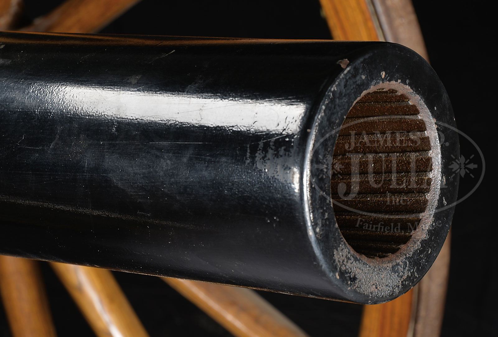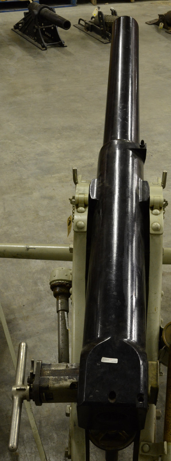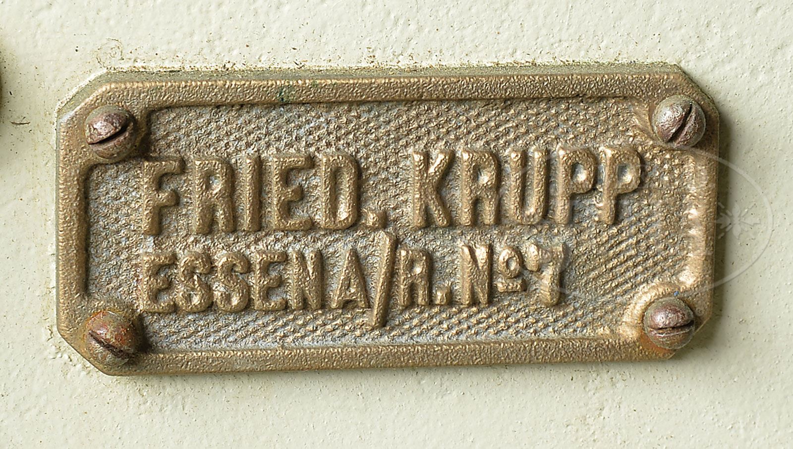 FRIEDRICH KRUPP 1893 DATED 75 MM SLIDING BREECH BLOCK MOUNTAIN GUN ON FIELD CARRIAGE.SN 7. This well conditioned gun is complete with breech marked, “FRIED.KRUPP/ESSEN 1893”. Right trunnion marked “331kg” which translates to about 728 lbs. Carriage has makers plaque on left side and “NO.7”. 71” from breech to muzzle. This cannon has a sliding breech block which locks into place with a large rotating hand crank shaft much the same way that someone would wind their watch. Once in place a steel plug articulates into a socket which holds the breech in place. This appears fully functional. Front sight is just forward of trunnions and it’s a simple post. Rear sight is a brass post within a ring. All steel carriage with brass hubs and wooden spoke wheels, “FRIED. KRUPP/ESSEN A/R No. 7” on right side plaque. Loading accouterments present attached to carriage are the wooden trail bar, cartridge charger and cleaning brush. PROVENANCE: Springfield Arsenal, LLC Artillery Collection. CONDITION: Overall finish and appearance is very fine with over 95% black enamel paint on steel tube. Breech block is likewise is very fine condition. Chamber has fairly significant pitting and brown scale but rifling is strong and clearly defined lands, dark throughout. Carriage is also extremely fine with steel parts retaining over 90% of a pale khaki paint on steel parts, brass remaining unpainted turned to a dark patina. Nuts display evidence of having been removed from the bolts on the hubs. Wooden hardware of wheels also in extremely fine condition retains over 95% of a varnished refinish and are very solid and presentable. Steel tires in fine condition, uniformly brown and uniformly robust. Elevation gear is functional and of brass & steel construction. 4-54090 JS295 (25,000-30,000) – Lot 1426