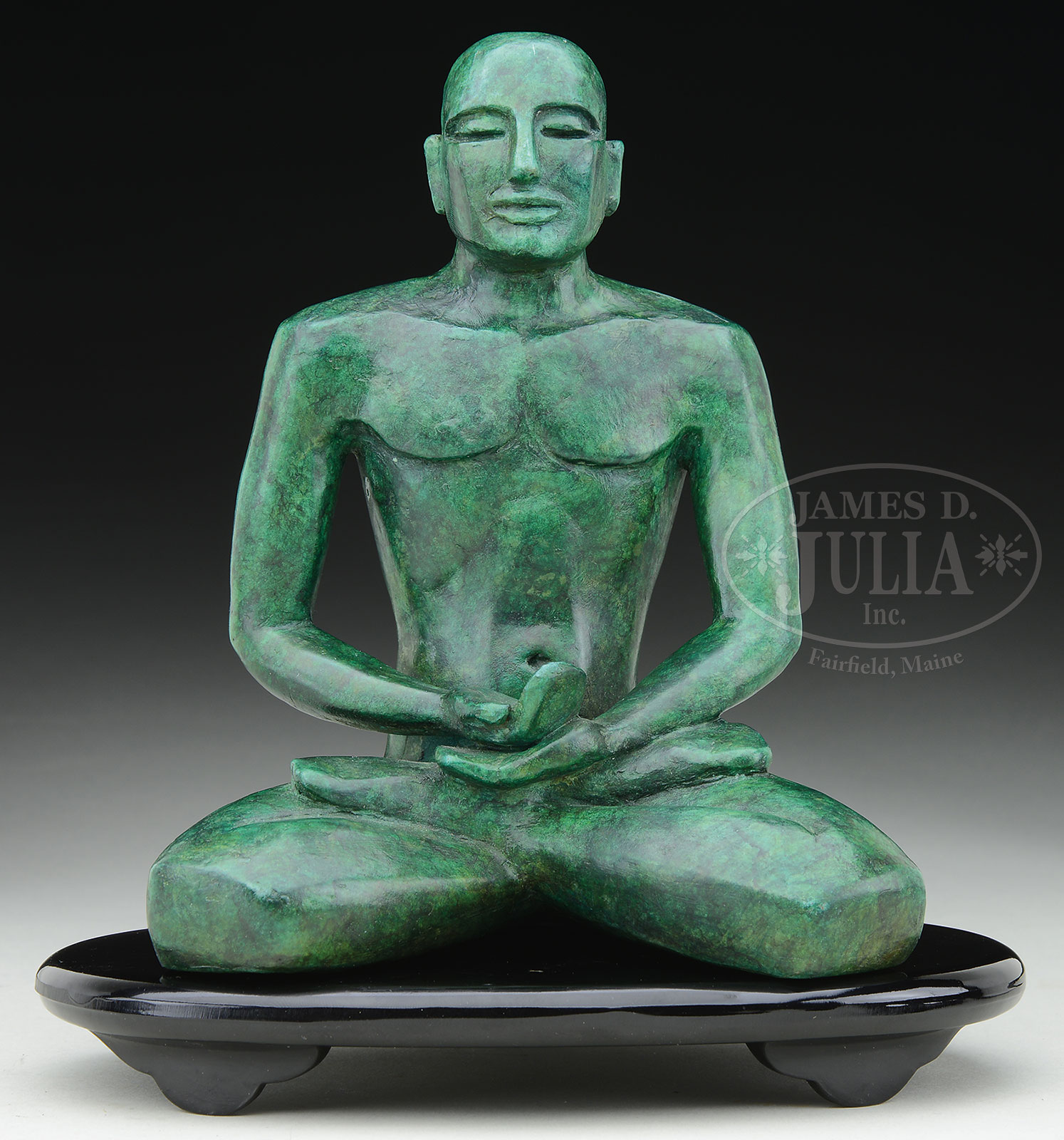 ELIZABETH STRONG-CUEVAS (American, 1929-) “MEDITATION, 1997”.Patinated bronze Accompanied by a small Chinese style black lacquered oval stand Signed with initials, numbered “9/36” dated 1997, Foundry “TALLIX” SIZE: 6-1/2″ h x 5-1/2″ at widest CONDITION: Very good, there are two threaded holes on bottom for mounting purposes 52228-3 (8,000-12,000) – Lot 1426