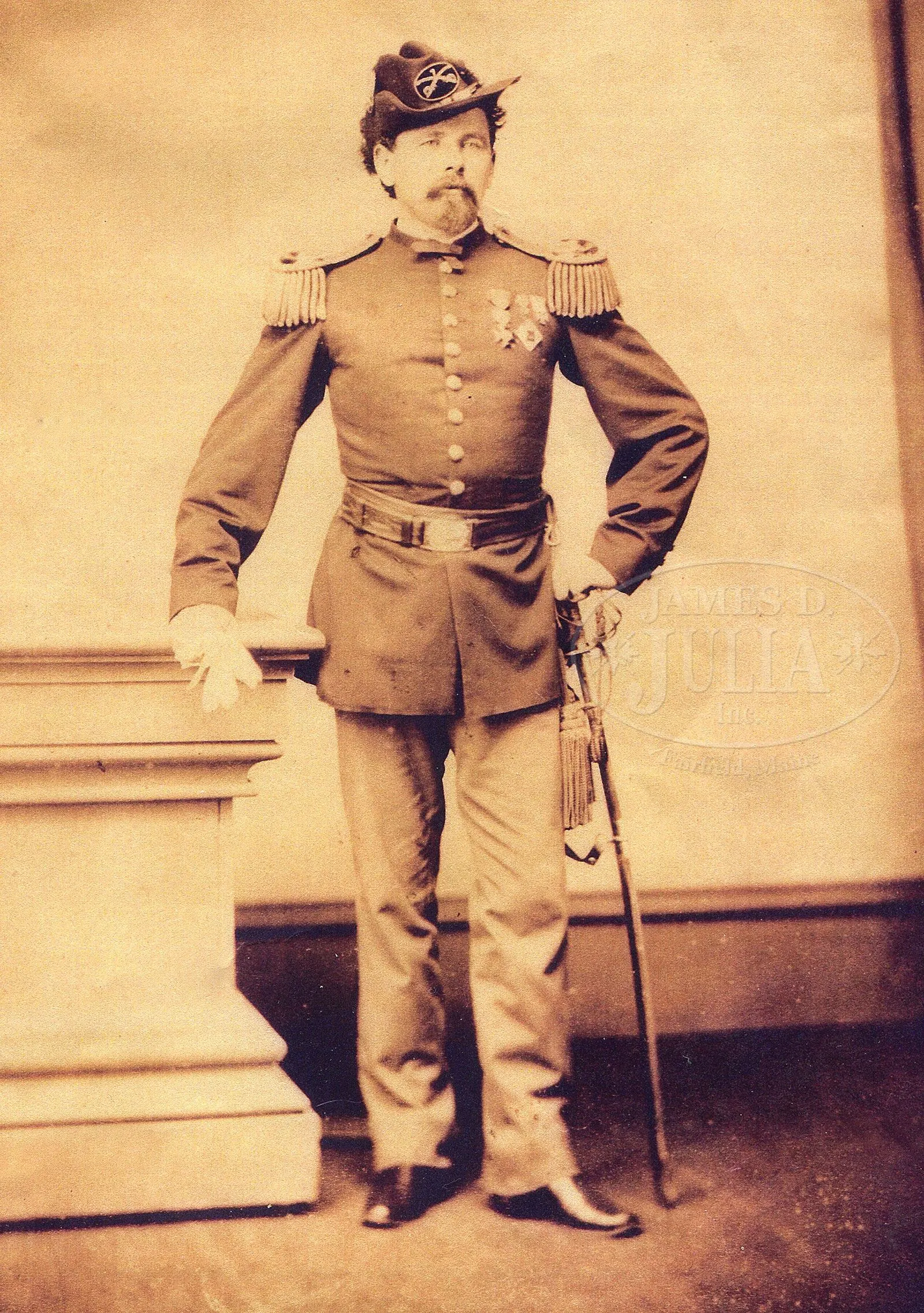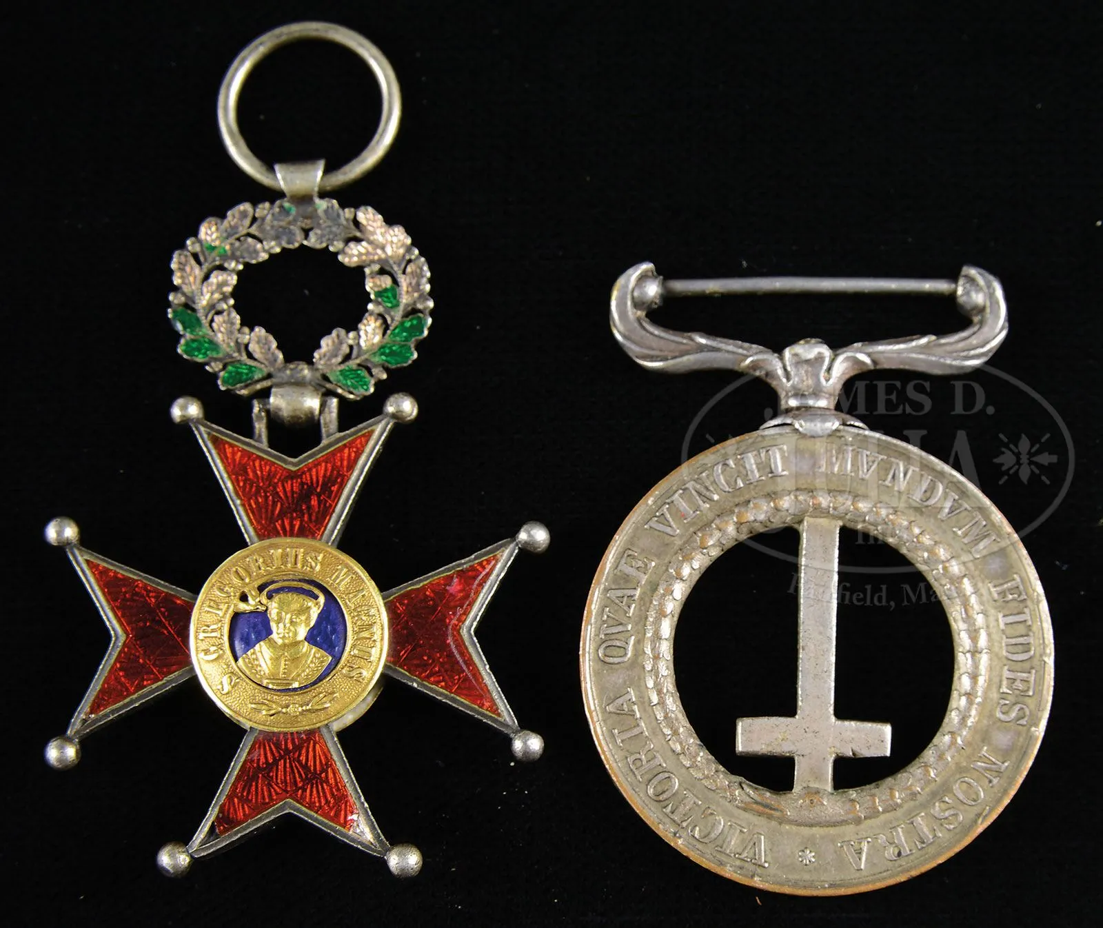 RARE AND UNIQUE MEDALS OF CAPTAIN MYLES KEOGH FROM CUSTER BATTLEFIELD.The “Pro Petri Sede Medaglia” was taken from the body of Myles Keogh when found June 27, 1876 on the east side of the battle ridge at the Little Big Horn. Myles Keogh is seen wearing these two medals in Civil War photography and during the Indian War. The “Medaglia di Pro Petri Sede” (Pro Petri Medal) was presented to Keogh after the Papal War by Pope Pius IX 1860, he was also awarded the “Ordine di San Gregorio” (St. Gregory Medal). Vatican records confirm these two medals both given to Keogh. The Papal War of 1860 ended with the fall of Ancona where as many as 100 Irish soldiers in the Battalion of St. Patrick were killed or wounded during those few weeks in September. For their service, each officer and enlisted man was awarded the Medal for Gallantry “Pro Petri Sede Medaglia” by Pope Pius IX. The medal is a circular, silvered nickel-silver medal with hollow center with inverted Latin cross. With a circular ring in the form of a scaled mythical creature swallowing it’s own tail, on ornate swivel suspension with ribbon bar; the face circumscribed ‘PRO PETRI SEDE’ (literally ‘for the seat of Peter’, meaning for the Vatican) above and ‘PIO*IX*P*M*A*XV’ (= Pius IX Pontifex Maximus 15th year, for the 15th year of the reign of Pope Pius IX = 1860); the reverse circumscribed ‘VICTORIA OVAE VINCIT MUNDUM FIDES NOSTRA’ (The victory of our flock conquers the world with our faith). These medals were of great importance to Keogh when he lost both in a fire at the famous Galt House Hotel in Louisville, Kentucky in 1865. In 1867 Keogh obtained replacement medals. Keogh affirmed he didn’t want to take leave for home in Ireland unless he had both medals with him. The last known photograph of Keogh taken in 1872 shows both medals prominently displayed on his left breast. These two medals of Myles Keogh are extremely well provenanced from direct family descent and lastly, one of the largest historians and authorities of Custer memorabilia, Dr. Elizabeth Lawrence. There are few personal mementos documented from the Custer battlefield that have a more interesting history than Keogh’s Medal for Gallantry “Medaglia di Pro Petri Sede” given him by Pope Pius IX in 1860 while he was fighting with other Irish Catholics in the Battalion of St. Patrick in the Papal Army. There are numerous accounts concerning Keogh’s body being not mutilated due to the fact he was wearing this medal. One of the most comprehensive texts on the Custer battle is Evan Connell’s 1984 Son of the Morning Star where he summarizes several accounts of Keogh’s body and this medal “Captain Myles Keogh had not been disfigured. He lay naked except for his socks, with a Catholic medal around his neck which usually is identified as an Agnus Dei, perhaps because Agnus Dei is a familiar phrase. Romantics describe it as a cross hanging from a golden chain. Almost certainly this medal was kept in a small leather purse or sheath and Keogh most likely wore it suspended by a leather thong or length of cord. It was the Medaglia di Pro Petri Sede awarded to him by Pope Pius IX for service with the Papal Army.” In the most important biography of Keogh, written in 1939 by Edward Luce Keogh, Comanche and Custer. Luce was positive it was “the Pro Petri” medal that he wore and further claimed it was in “… a leather case attached to a cord around his neck…””. Accompanying these medals is a file of correspondence from descendants and Dr. Lawrence concerning medal. It is interesting to note that in a copy of Keogh’s will written just three days prior to his death states his $10,000 life insurance policy and all his personal affects would be given to his sister Margaret Keogh in Ireland. In an article posted online, PROVENANCE: Myles Keogh 7th US Cavalry 1860, Margaret Keogh (sister) Kil Kenny, Ireland 1876, Dr. Desmond Blanchfield Keogh,Carlow, Ireland 1947, Garret Keogh Dublin, Ireland 1988, Dr. Elizabeth Atwood Lawrence 1988, Dr. Robert P. Lawrence 2003. CONDITION: Very good overall. Minor chipping in red enamel on St. Gregory Medal. Suspension ring opened on St. Gregory cross to green enameled wreath which is chipped, missing about 60% of enamel overall. Pro Petri still exhibits some luster, however plating is worn and scratched over much of its surface with small reductions of silver plating on cross as can be seen in photographs. 4-54477 JS (30,000-50,000) – Lot 1428 Click here to view provenance