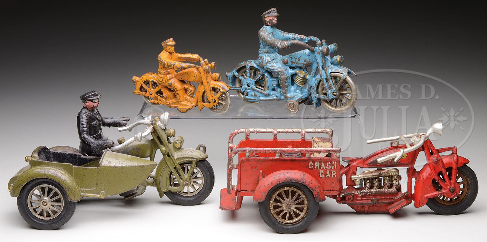 LOT OF 4 CAST IRON MOTORCYCLE TOYS.1) Blue Harley Davidson with rider. Moving head “cop” rides atop motorcycle marked “Harley Davidson”. 2) Hubley Army cycle with sidecar (missing rider). Policeman rides atop large twin powered cycle. 3) Hubley orange cycle marked “Harley Davidson” with nickel plated cast wheels. 4) Large Hubley crash car cycle. Three-wheeler shows 4 cylinder engine and rear bed area marked “Crash Car”. SIZE: Largest is 12″ l. CONDITION: 1) Break to casting on front fender, paint is fair to good. 2) Missing tank decal, paint is good – missing rider. 3) No breaks or chips to castings, paint is good. 4) Missing rider, hose reel and tools. Tank decals worn off. 1-14361 (500-700) – Lot 1429 Auction: Advertising, Toy & Doll Auction - Fall 2014 Please Note: All prices include the hammer price plus the buyer’s premium, which is paid by the buyer as part of the purchase price. The prices noted here after the auction are considered unofficial and do not become official until after the 46th day. |